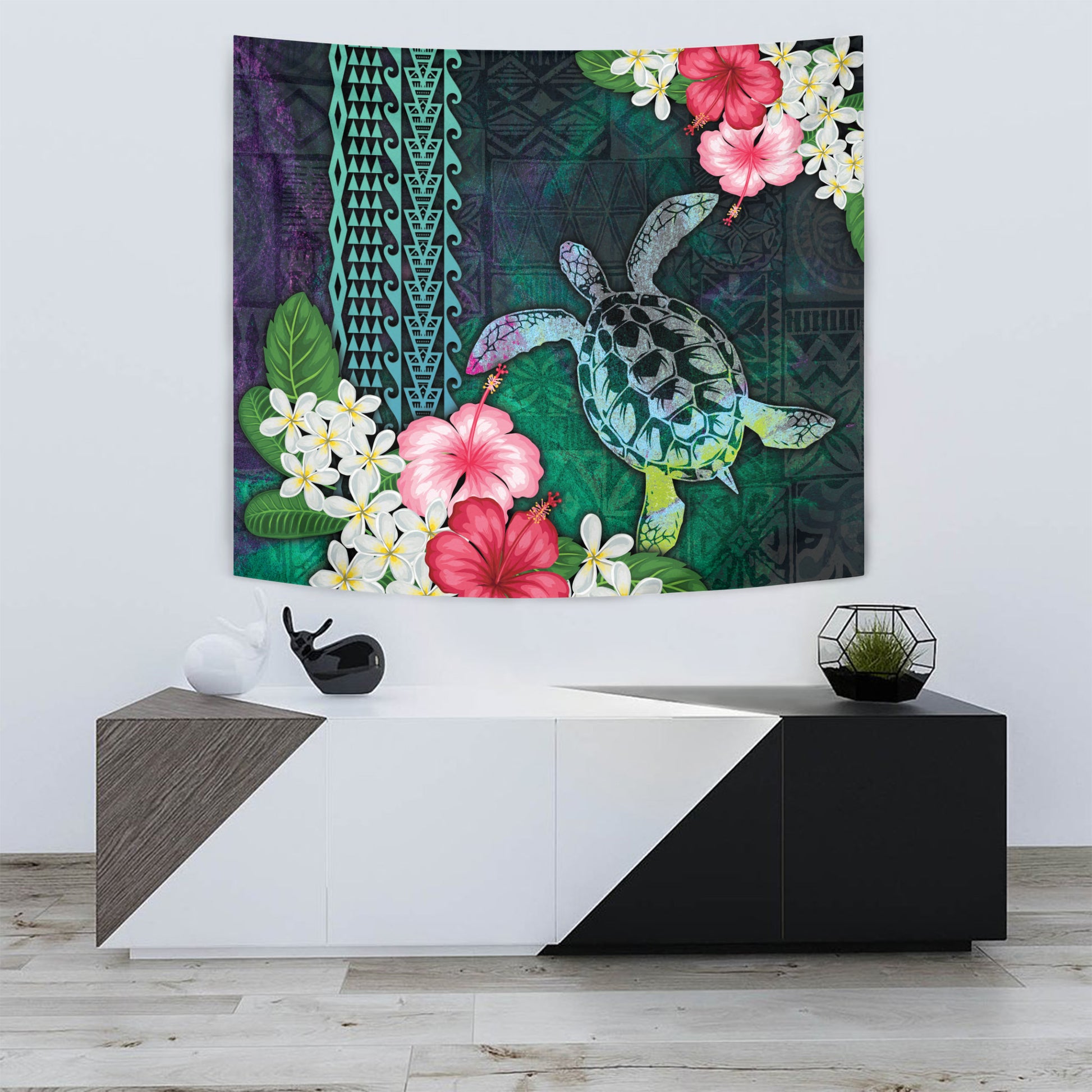 Hawaii Tapestry Sea Turtle Abstract Background With Tropical Flowers Hibiscus And Plumeria