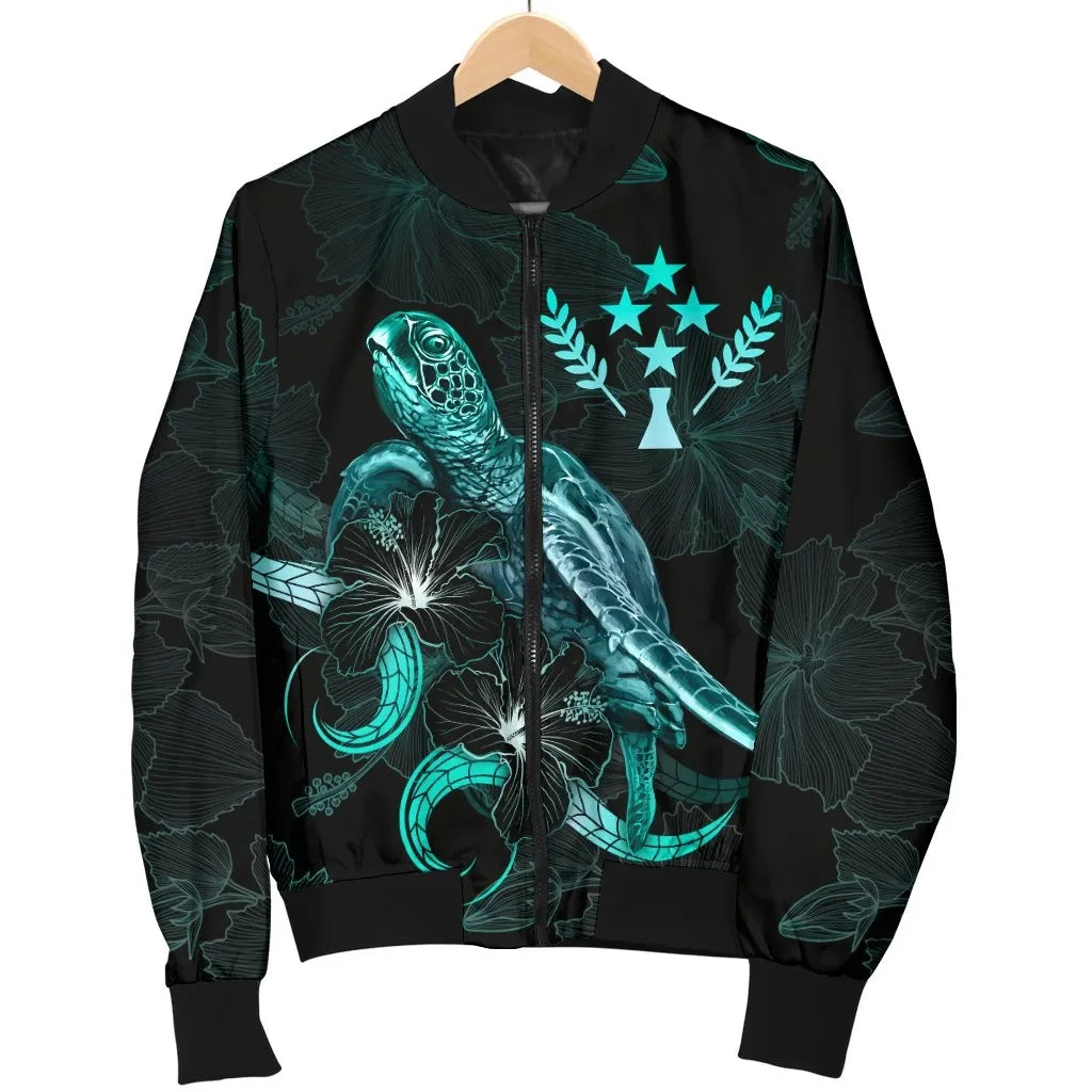 Kosrae Polynesian Bomber Jacket - Turtle With Blooming Hibiscus Turquoise
