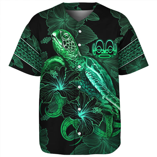 Marquesas Islands Baseball Shirt Sea Turtle With Blooming Hibiscus Flowers Tribal Green