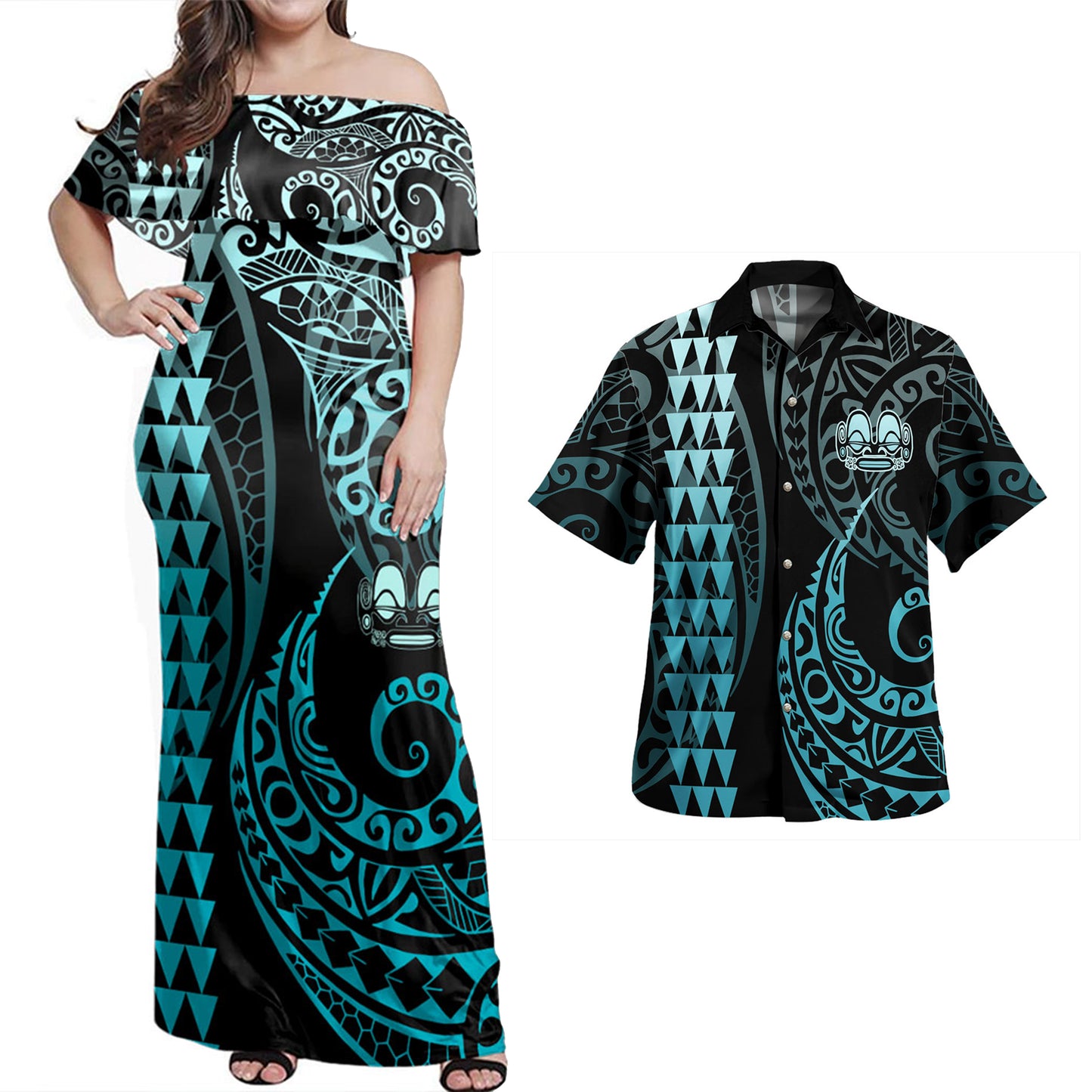 Marquesas Islands Combo Dress And Shirt Kakau Style Turquoise