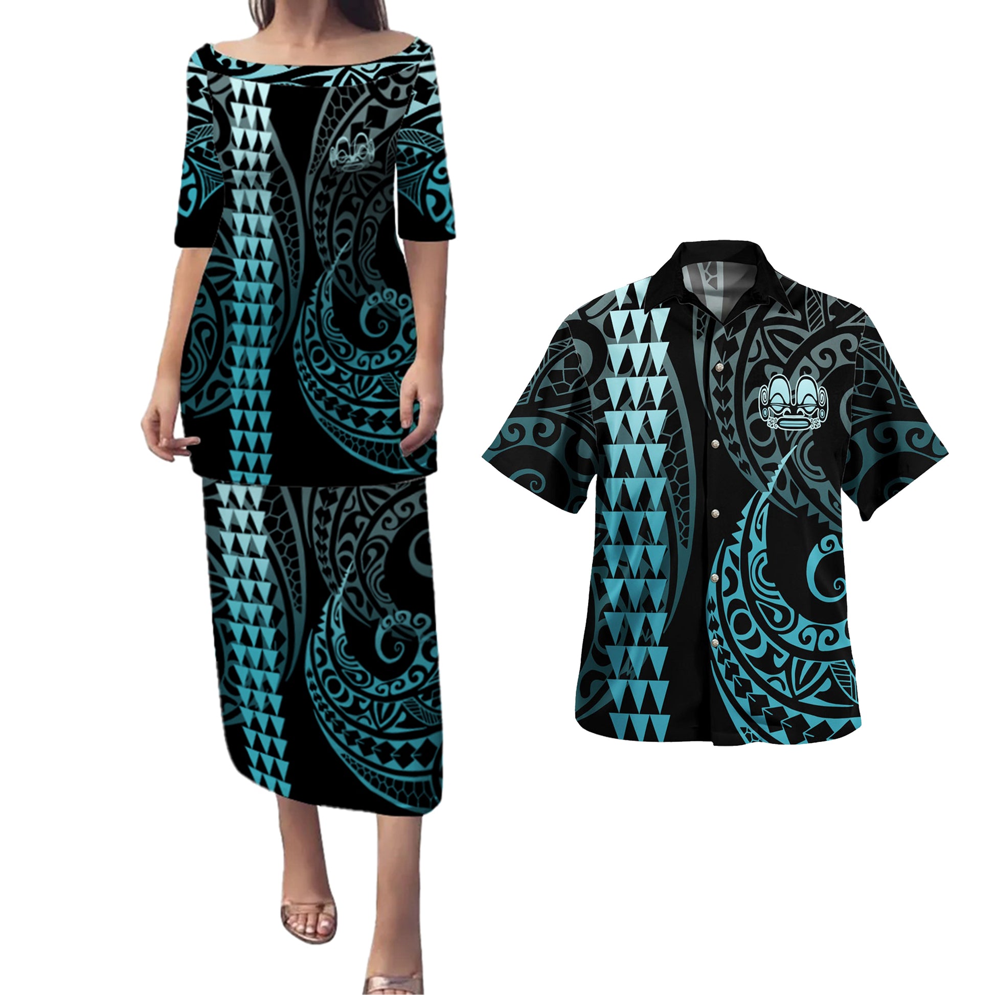 Marquesas Islands Combo Puletasi And Shirt Kakau Style Turquoise