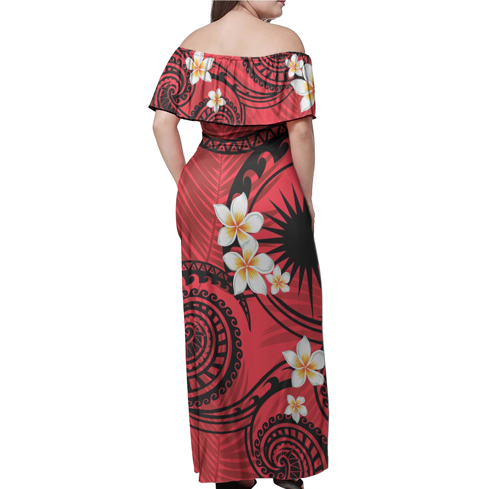 Marshall Islands Off Shoulder Long Dress Plumeria Flowers Tribal Motif Red Version