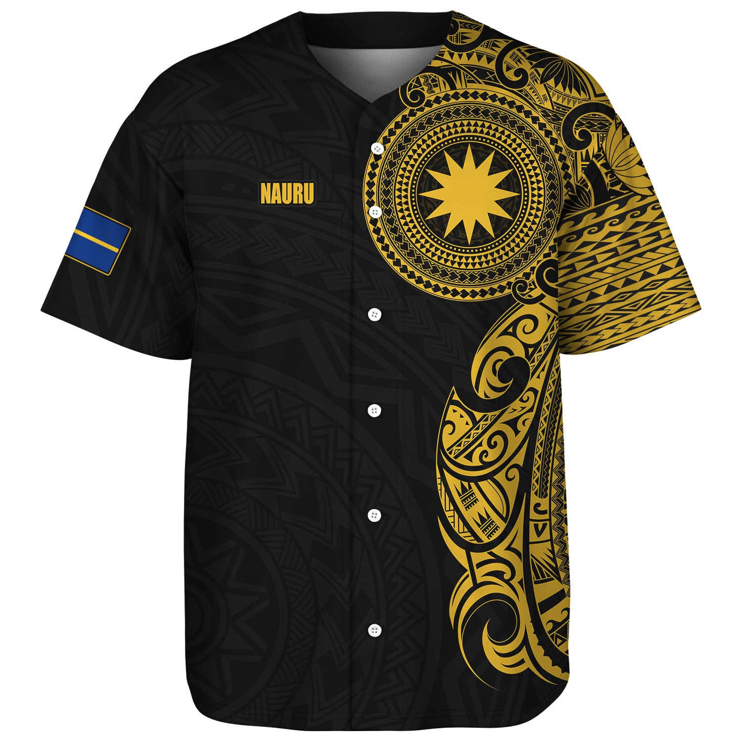 Nauru Baseball Shirt Custom Polynesian Half Sleeve Gold Tattoo With Seal Black