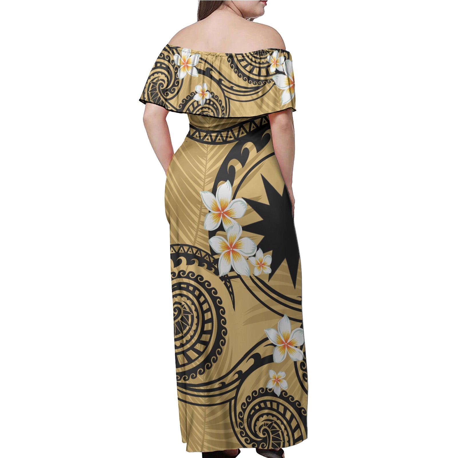 Nauru Off Shoulder Long Dress Plumeria Flowers Tribal Motif Yellow Version