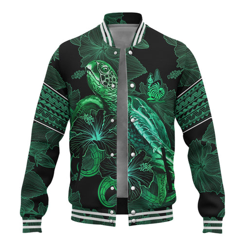 New Caledonia Baseball Jacket Sea Turtle With Blooming Hibiscus Flowers Tribal Green