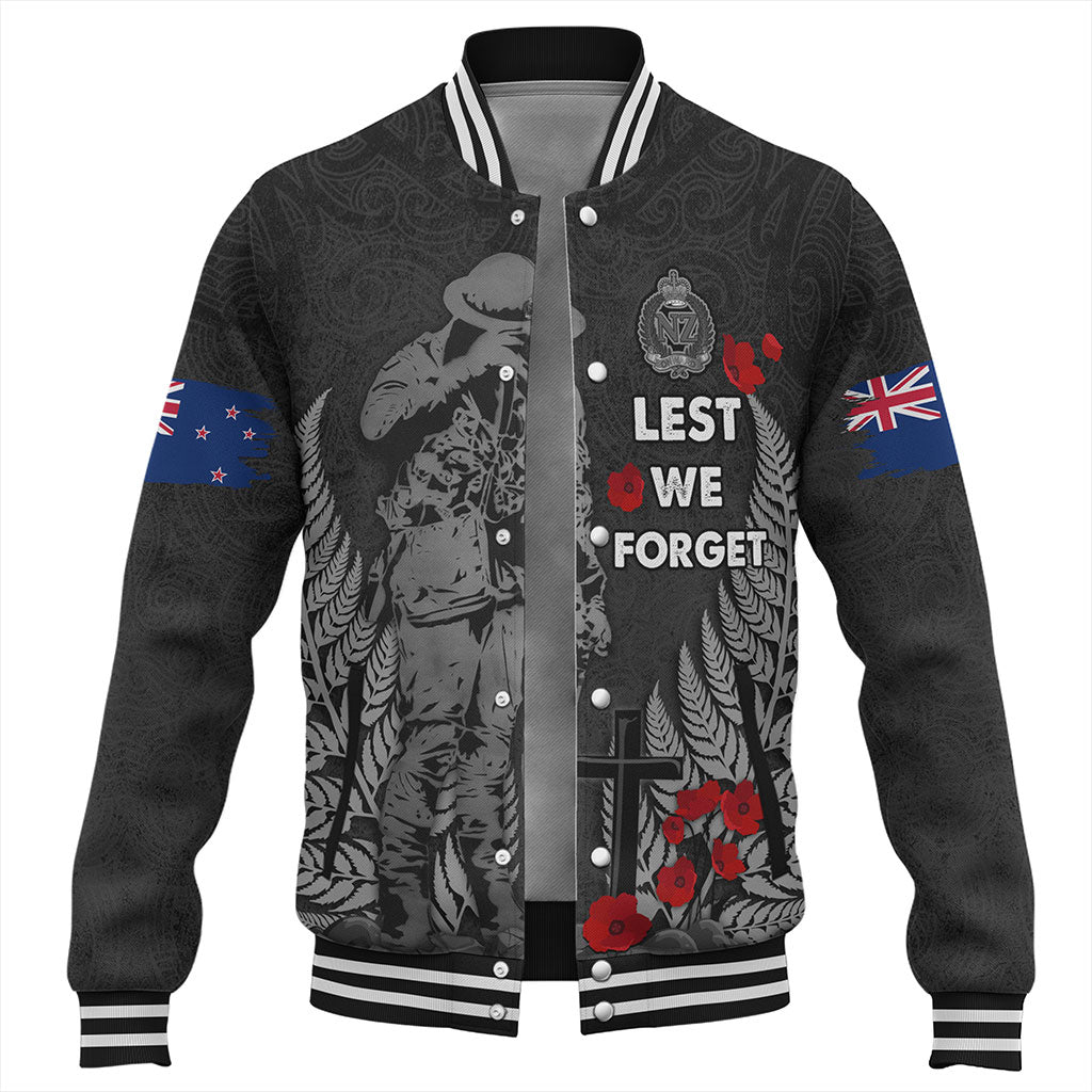 New Zealand Baseball Jacket Maori Tribal Silver Fern Lest We Forget Solider