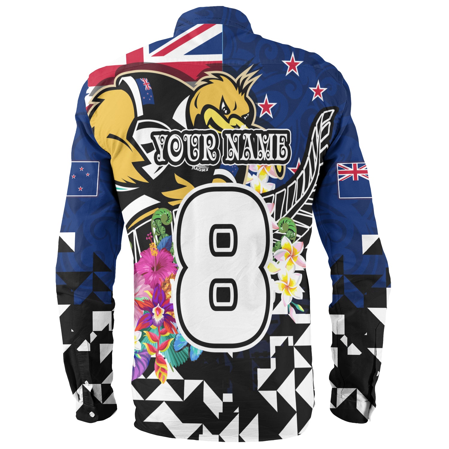 New Zealand Long Sleeve Shirt Custom Maori Kiwis Rugby Silver Fern Black Hexagon Tropical Jersey
