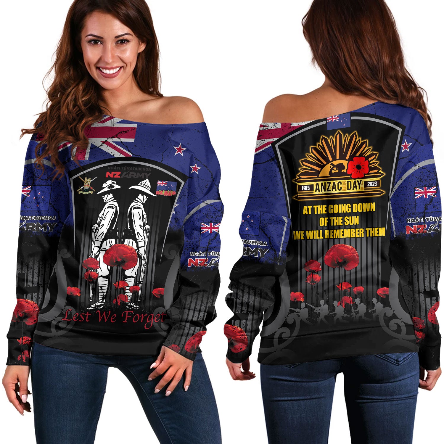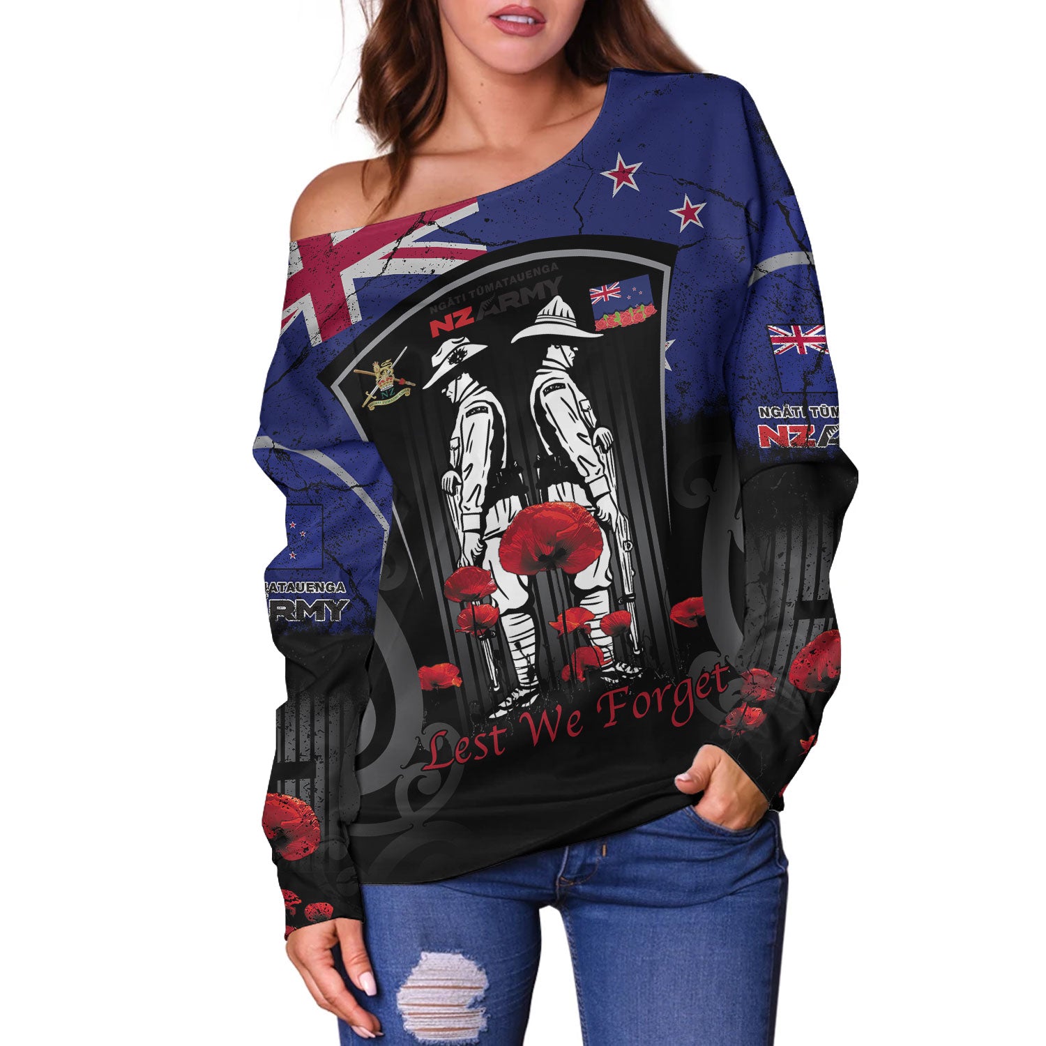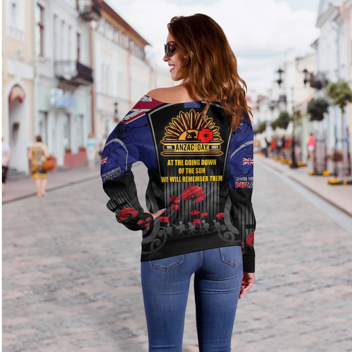 New Zealand Off Shoulder Sweatshirt Custom New Zealand Anzac Day With Poppy Flowers And Traditional Maori Patterns