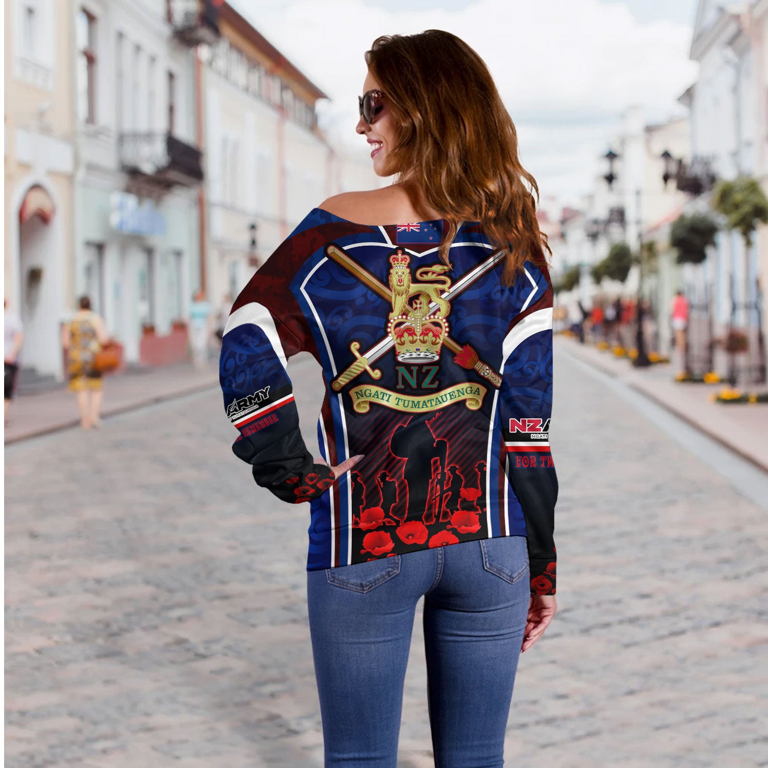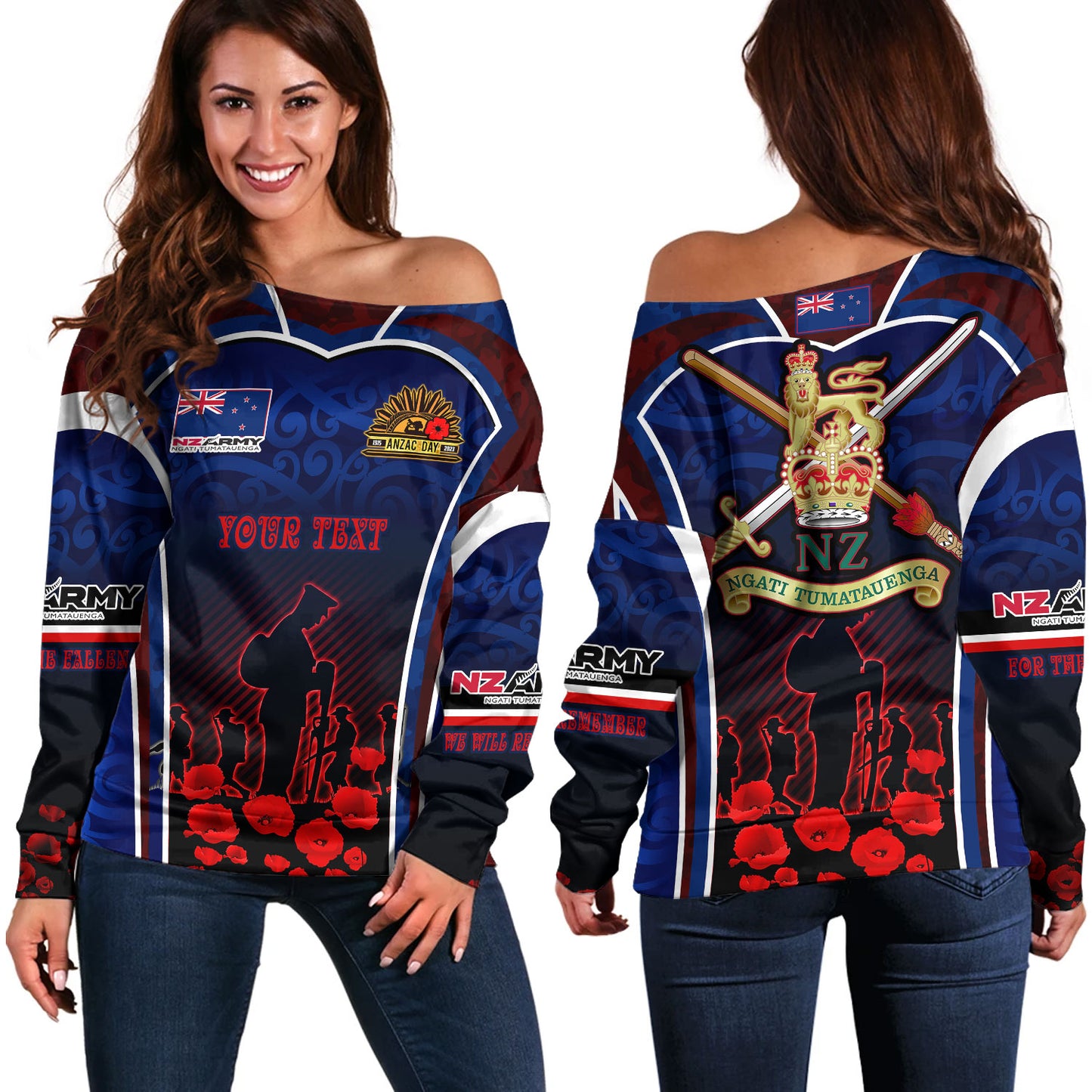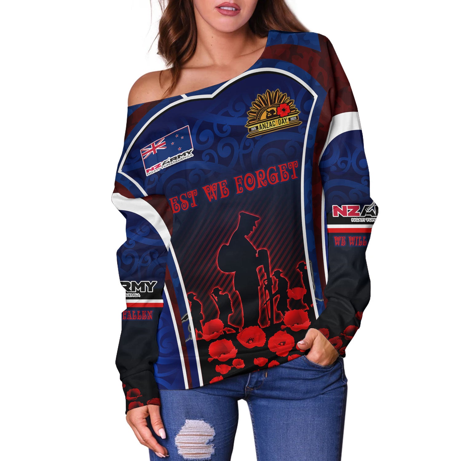 New Zealand Off Shoulder Sweatshirt Custom New Zealand Army Keeping Anzac Spirit Lives Poppies Maori Style