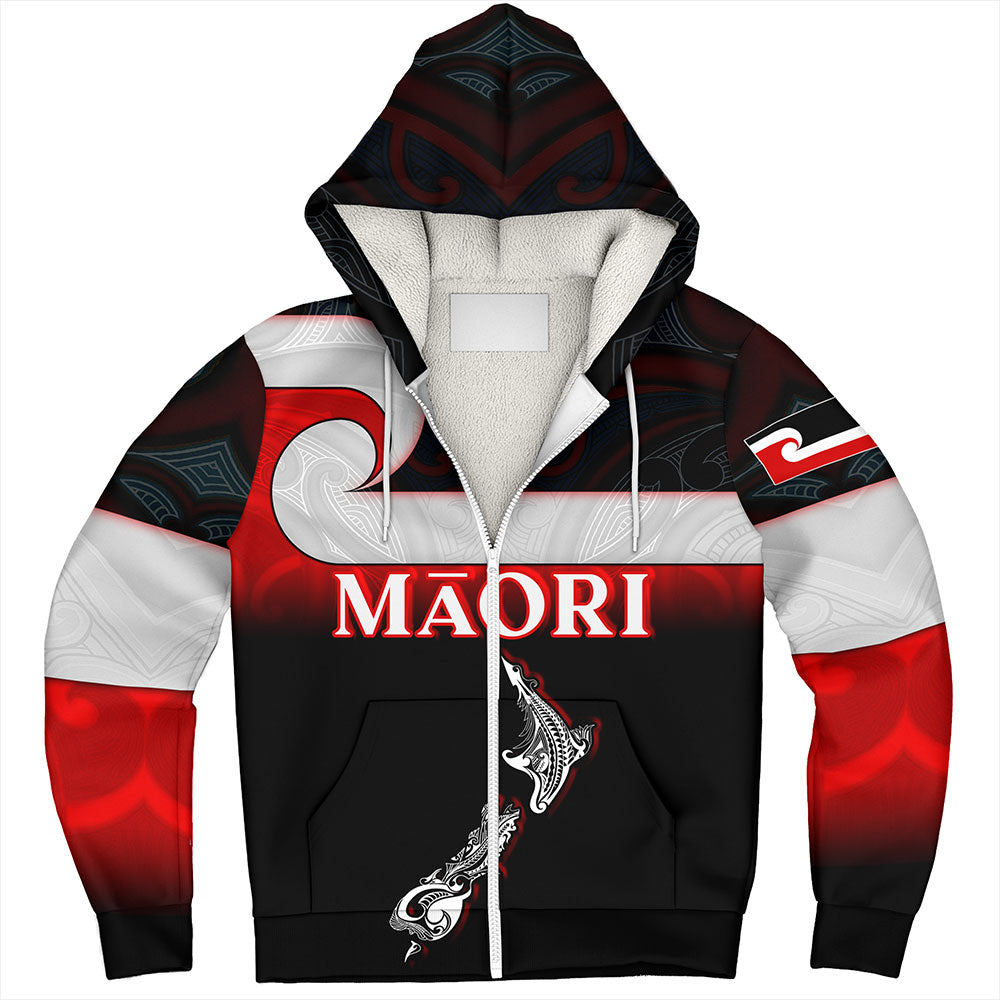 New Zealand Sherpa Hoodie - Maori Face And Flag Patterns