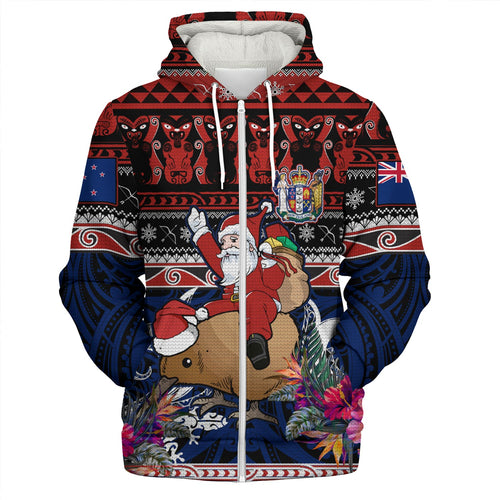 New Zealand Sherpa Hoodie Santa Riding Kiwi Bird Meri Kirihimete Ugly Christmas Maori Patterns