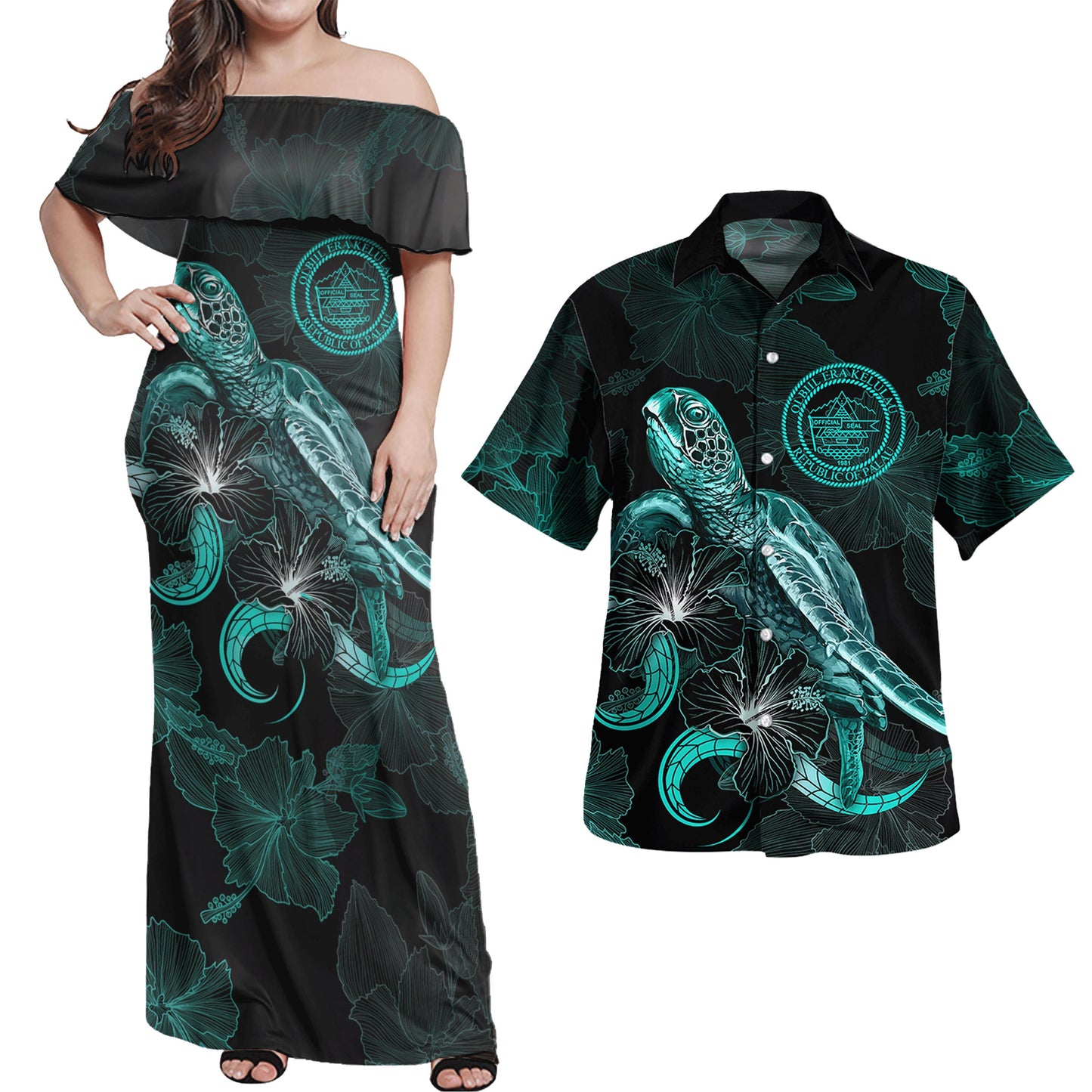 Palau Combo Dress And Shirt - Palau Coat Of Arms With Polynesian Turtle Blooming Hibiscus Turquoise