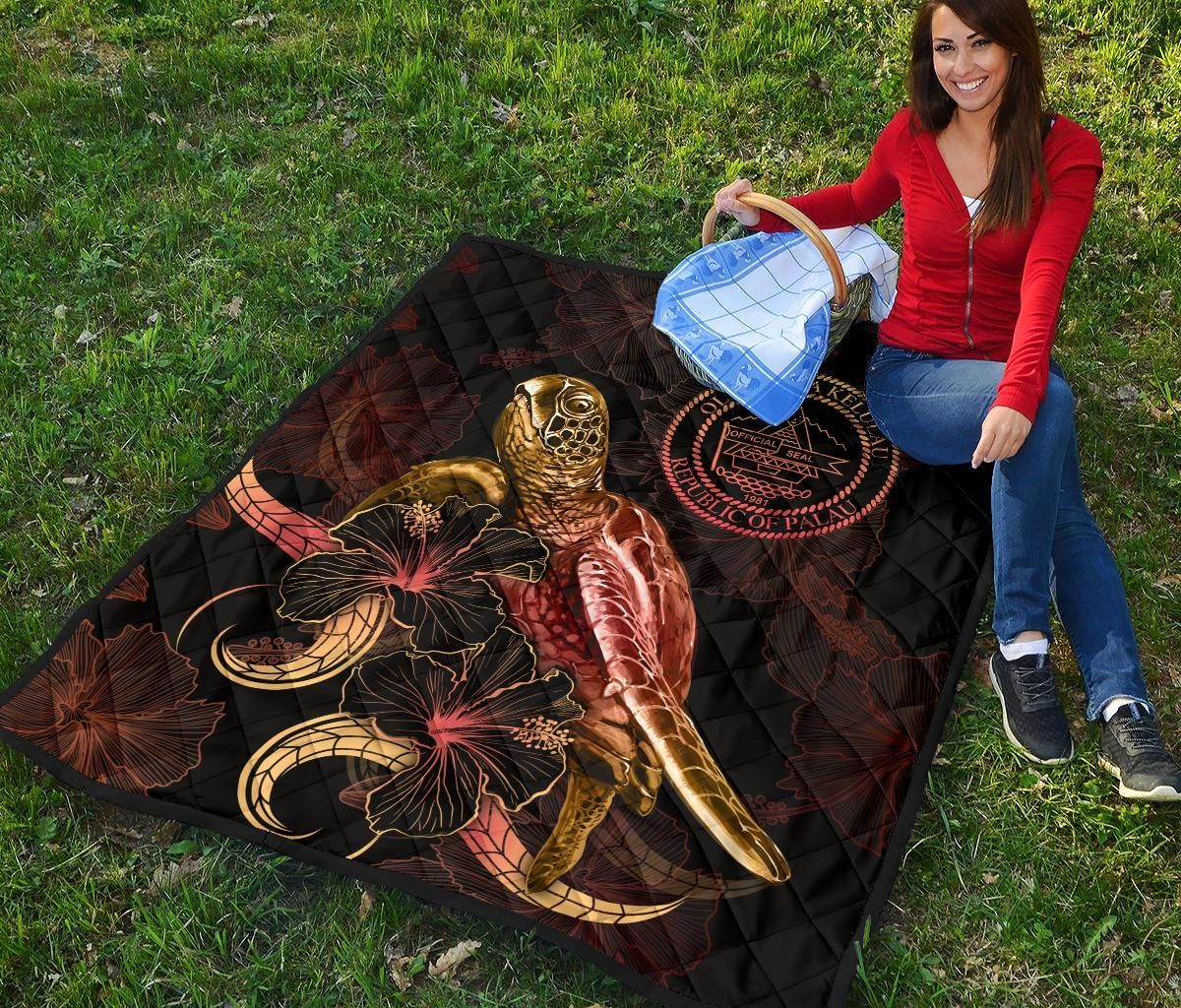 Palau Polynesian Premium Quilt - Turtle With Blooming Hibiscus Gold