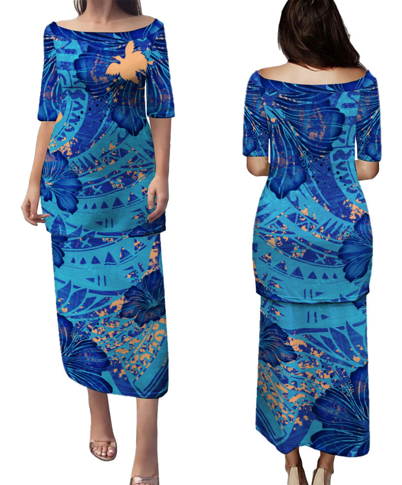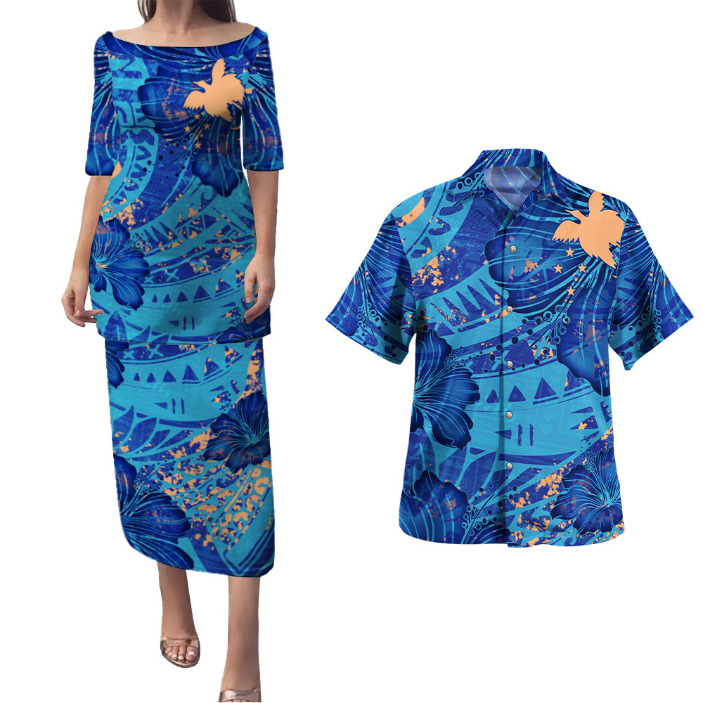 Papua New Guinea Combo Puletasi And Shirt Hibiscus With Polynesian Pattern Blue Version