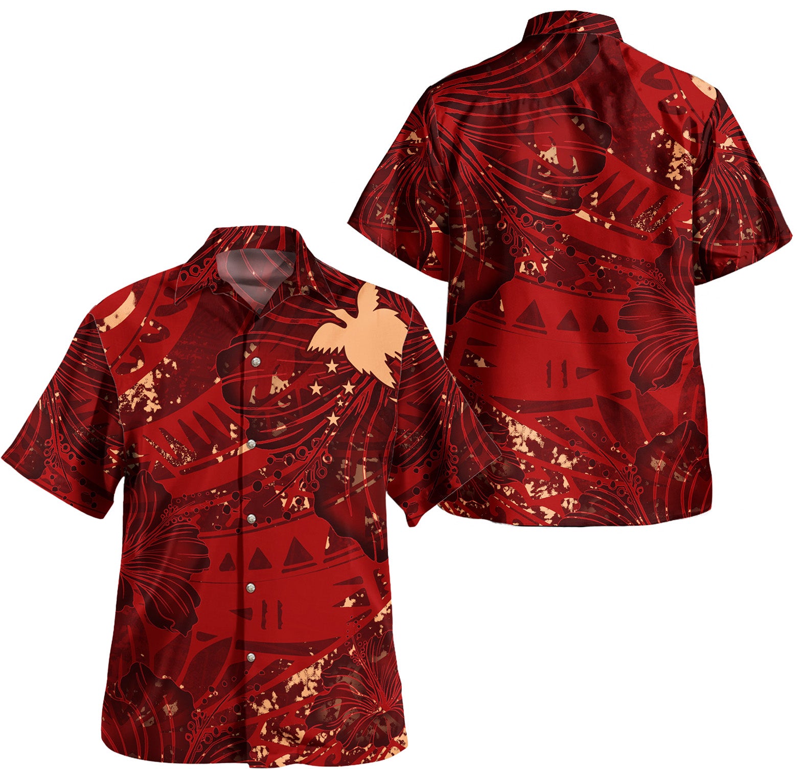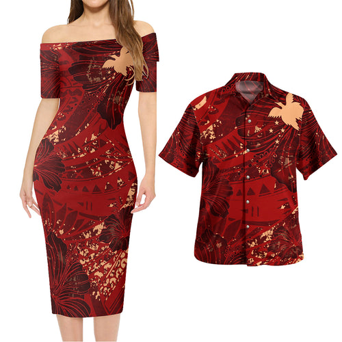 Papua New Guinea Combo Short Sleeve Dress And Shirt Hibiscus With Polynesian Pattern Red Version