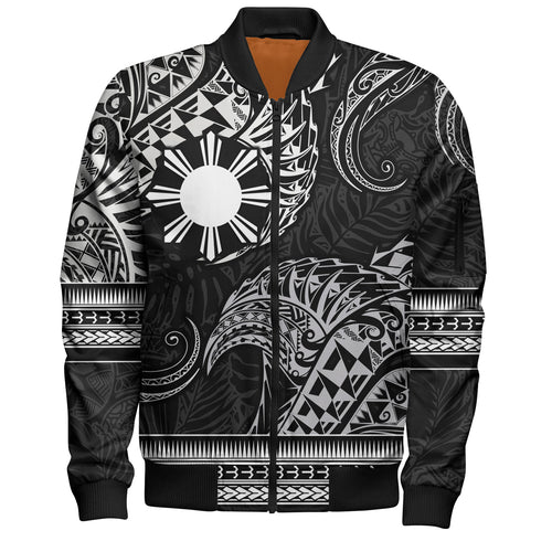 Philippines Filipinos Bomber Jacket Filipino Coat Of Arms With Leaves and Tribal Patterns