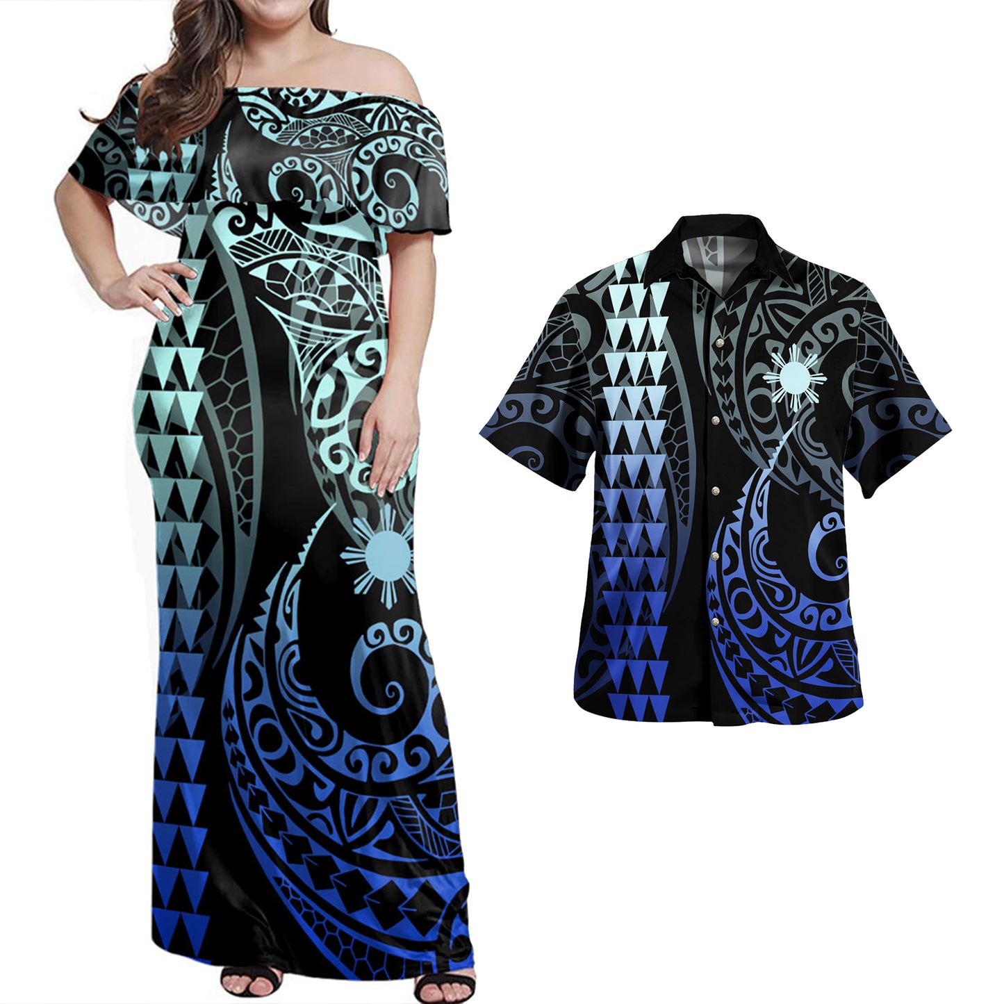 Philippines Filipinos Combo Dress And Shirt Kakau Style Gradient Blue
