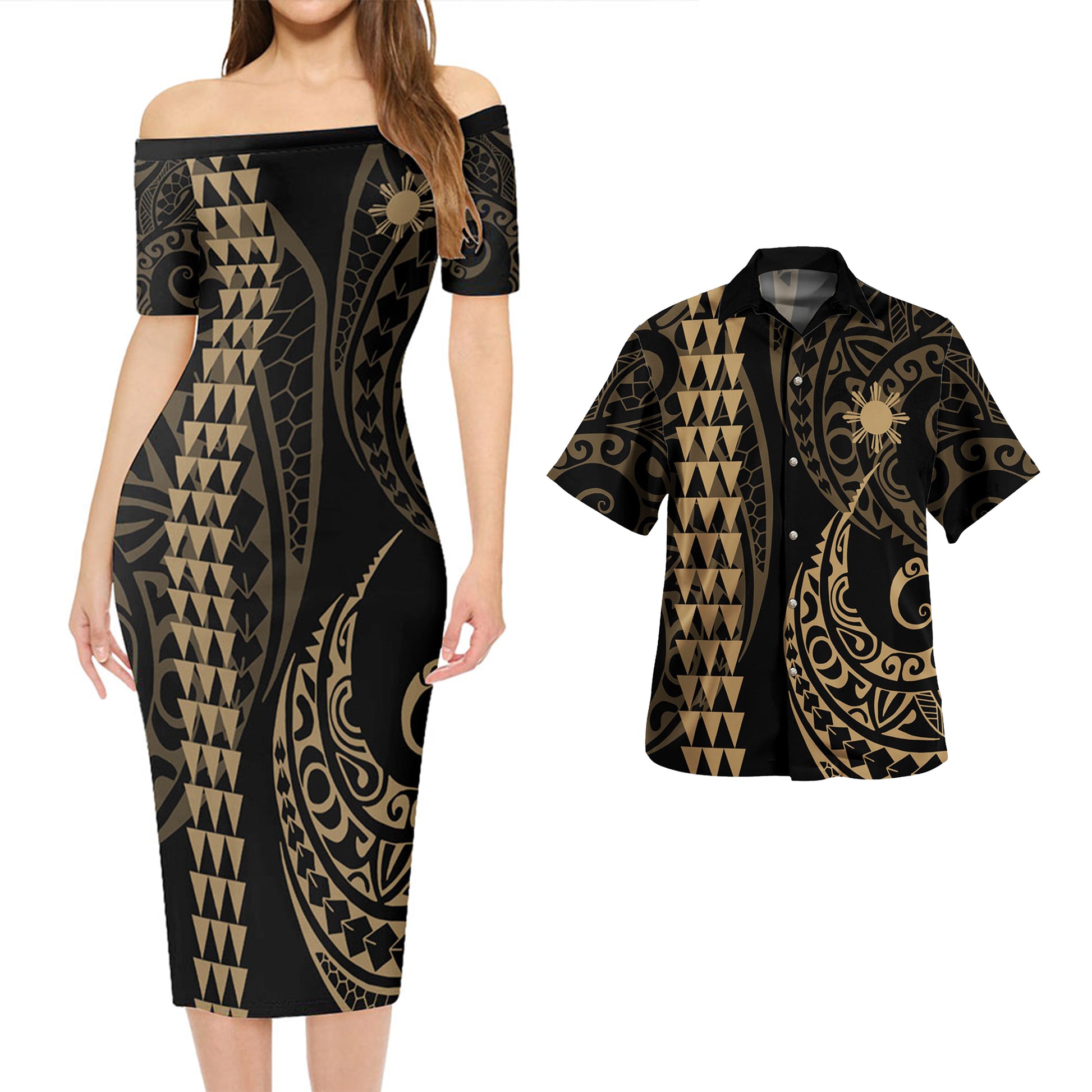 Philippines Filipinos Combo Short Sleeve Dress And Shirt Kakau Style Gold