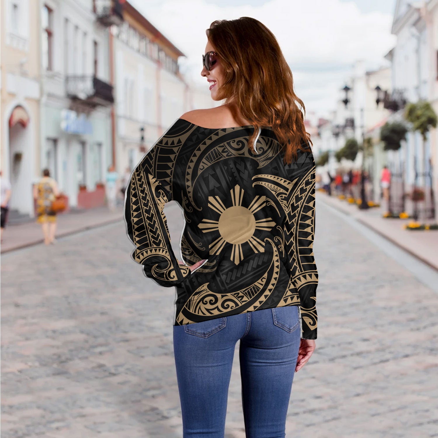 Philippines Filipinos Off Shoulder Sweatshirt Gold Tribal Wave