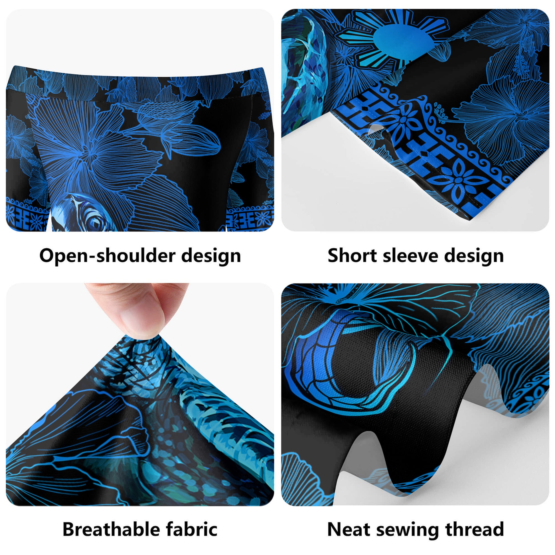 Philippines Filipinos Short Sleeve Off The Shoulder Lady Dress Sea Turtle With Blooming Hibiscus Flowers Tribal Blue