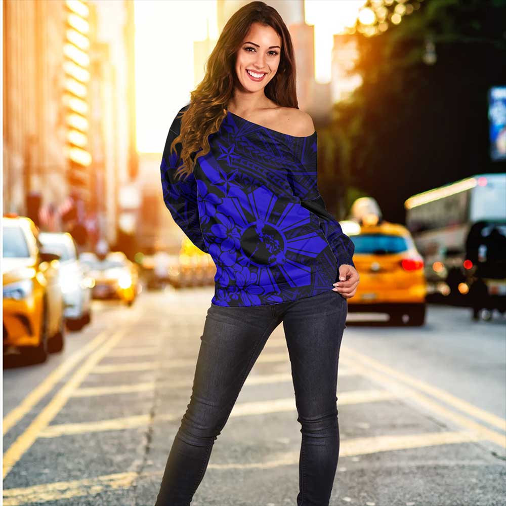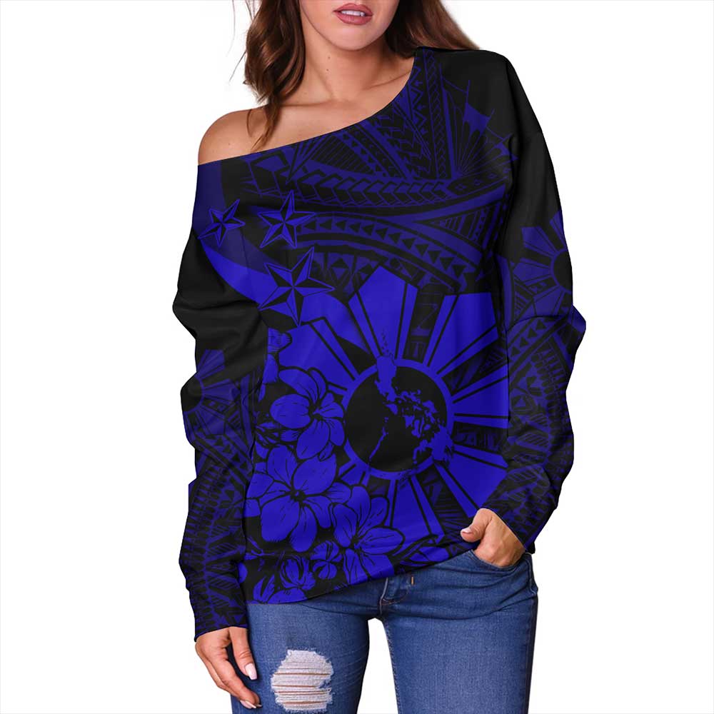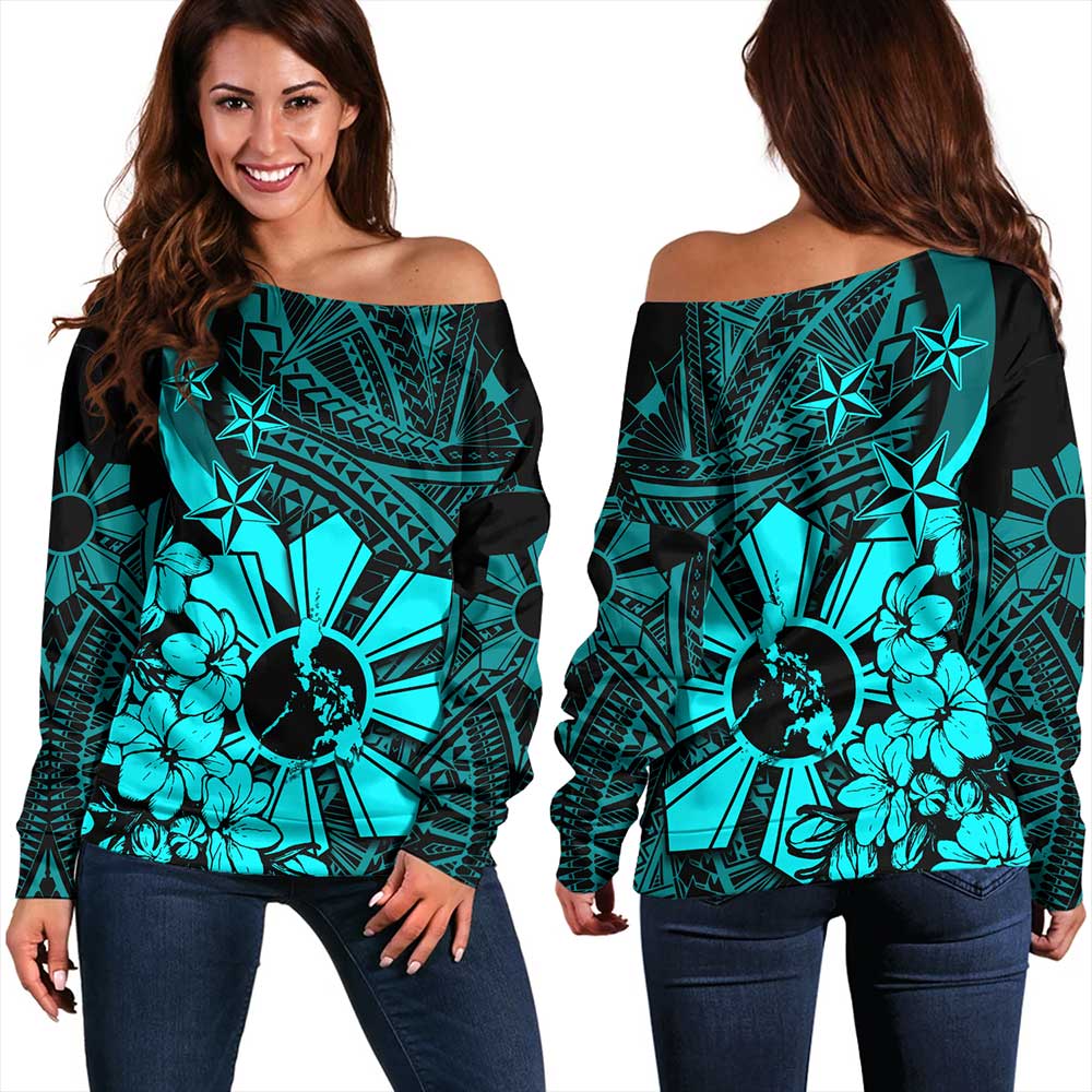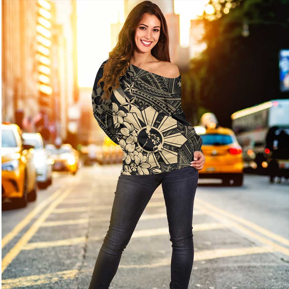 Philippines Off Shoulder Sweatshirt Polynesian Pattern Filipino Sampaguita
