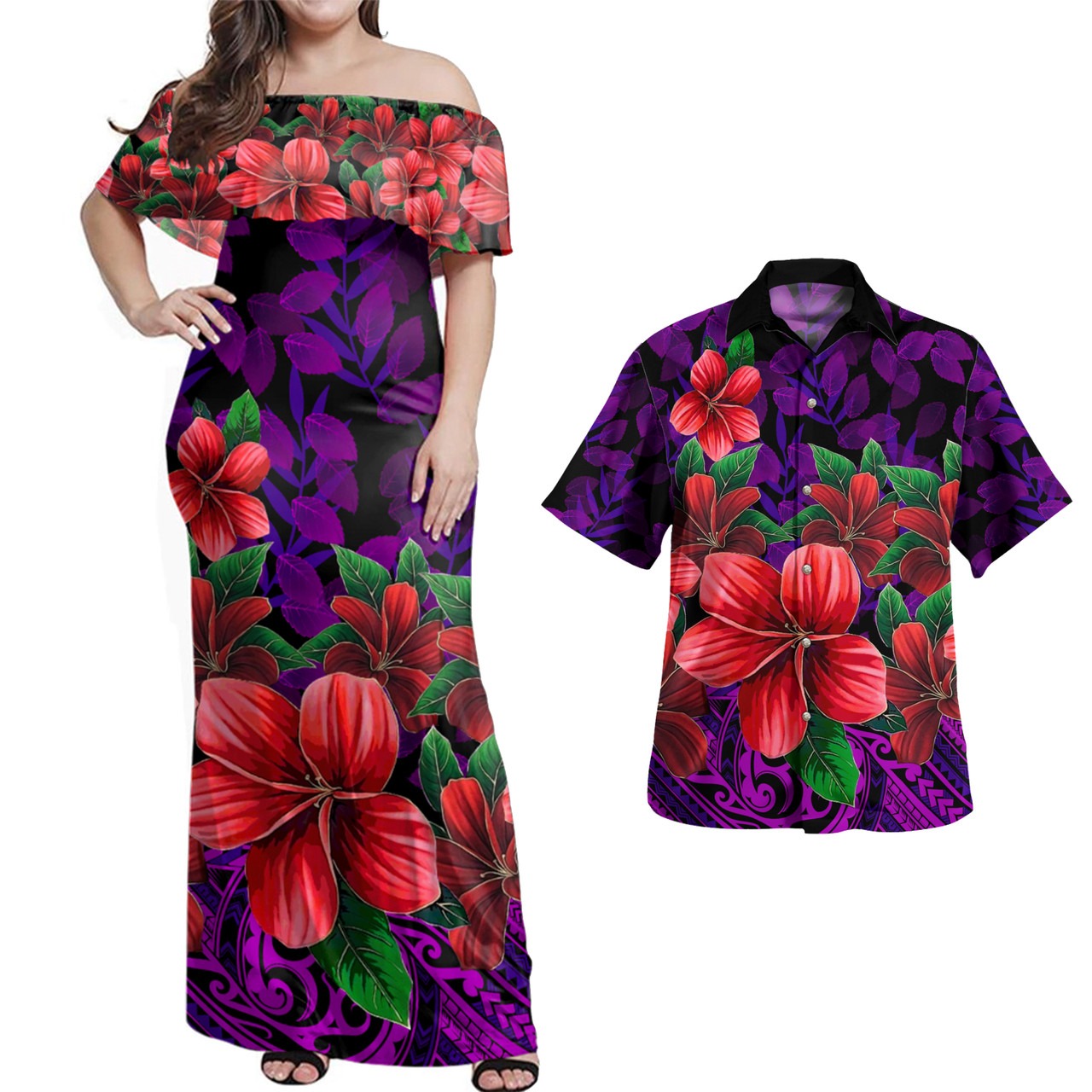 Polynesian Combo Off Shoulder Long Dress And Shirt Plumeria Tropical Leaf