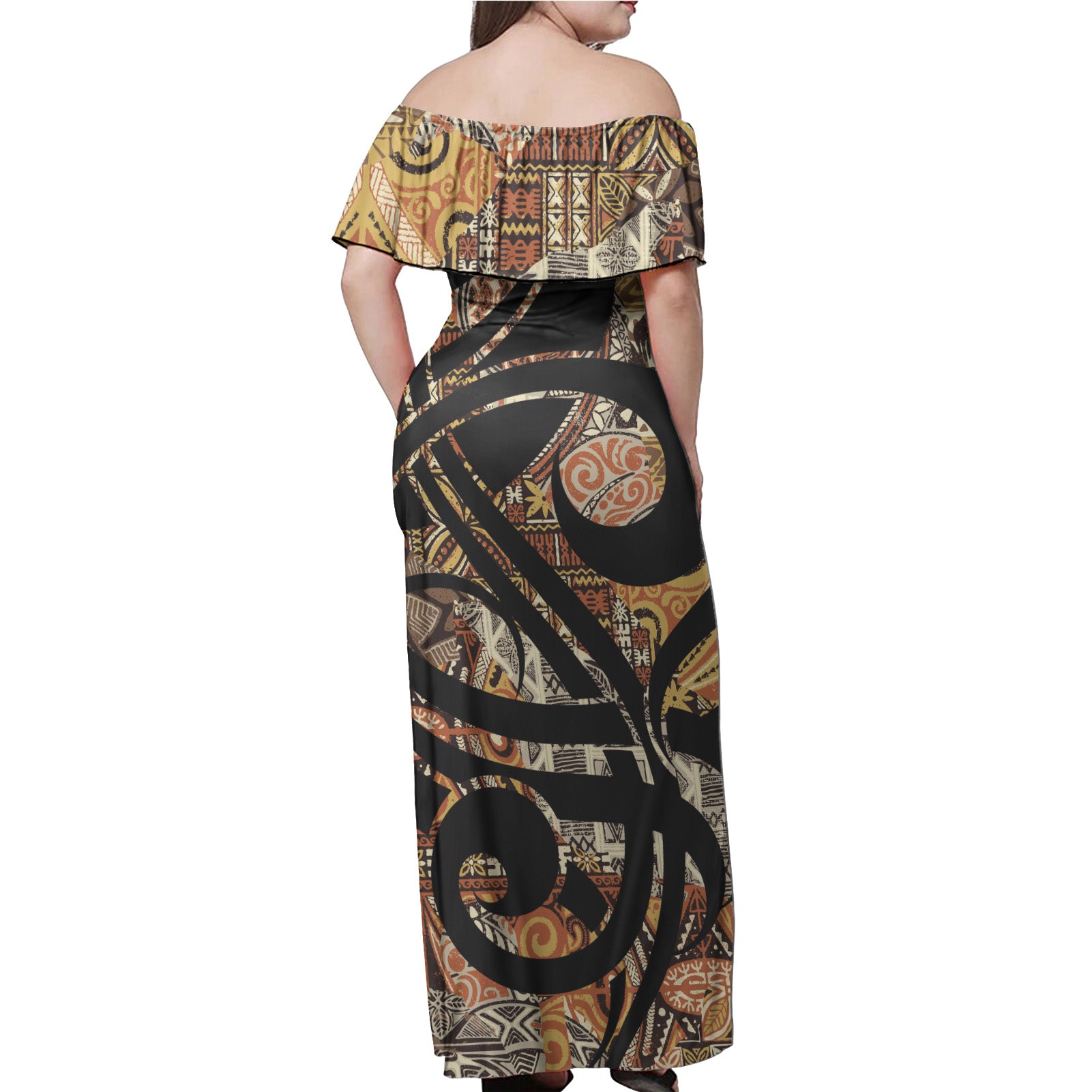 Polynesian Woman Off Shoulder Long Dress - Yellow Polynesian Pattern