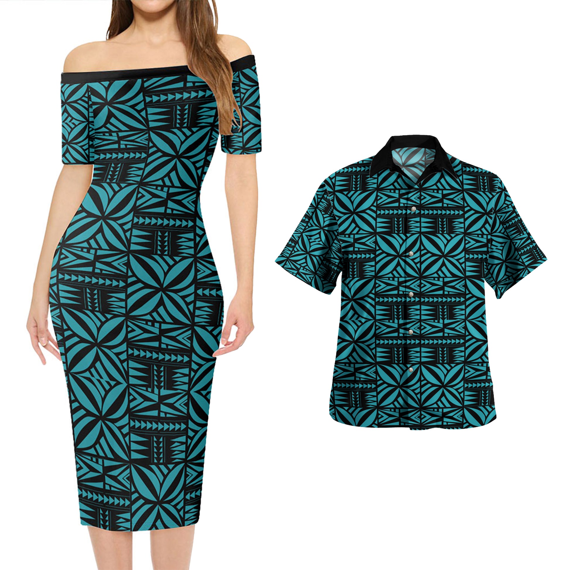 Samoa Combo Short Sleeve Dress And Shirt Design Stretch Print Fabric Turquoise