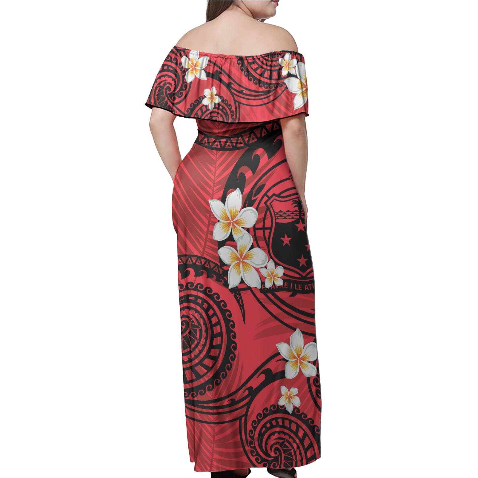 Samoa Off Shoulder Long Dress Plumeria Flowers Tribal Motif Red Version