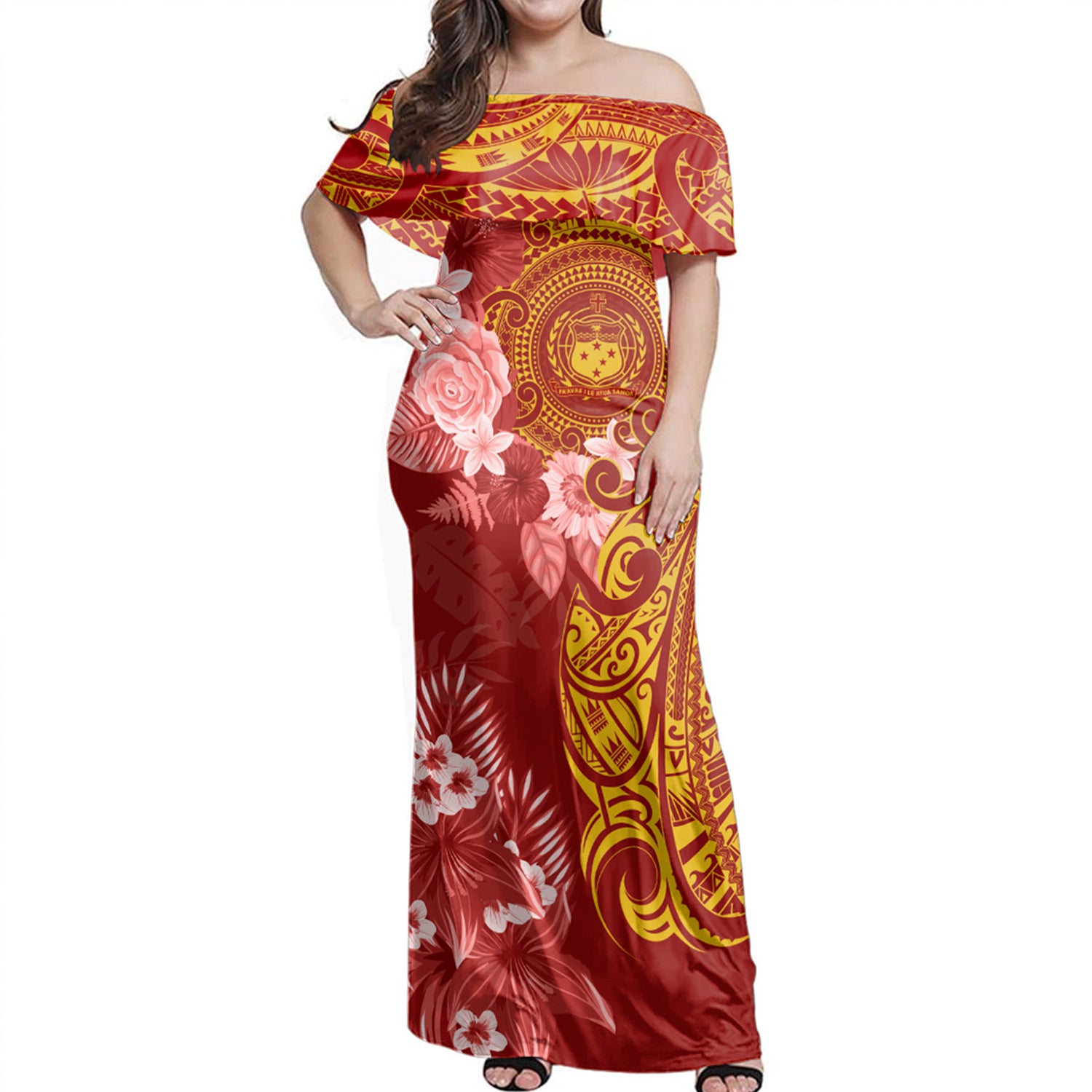 Samoa Off Shoulder Long Dress Polynesian Tropical Plumeria Tribal Red