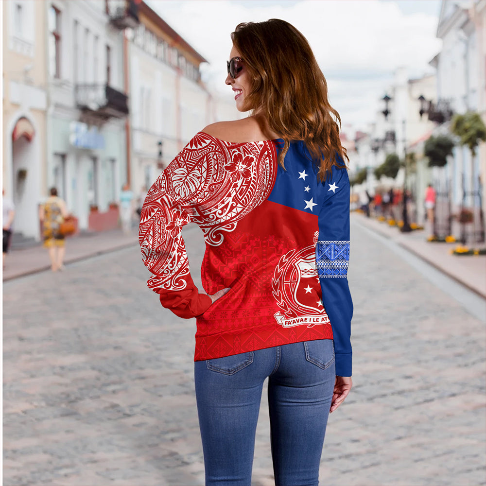Samoa Off Shoulder Sweatshirt Polynesian Flag With Coat Of Arms