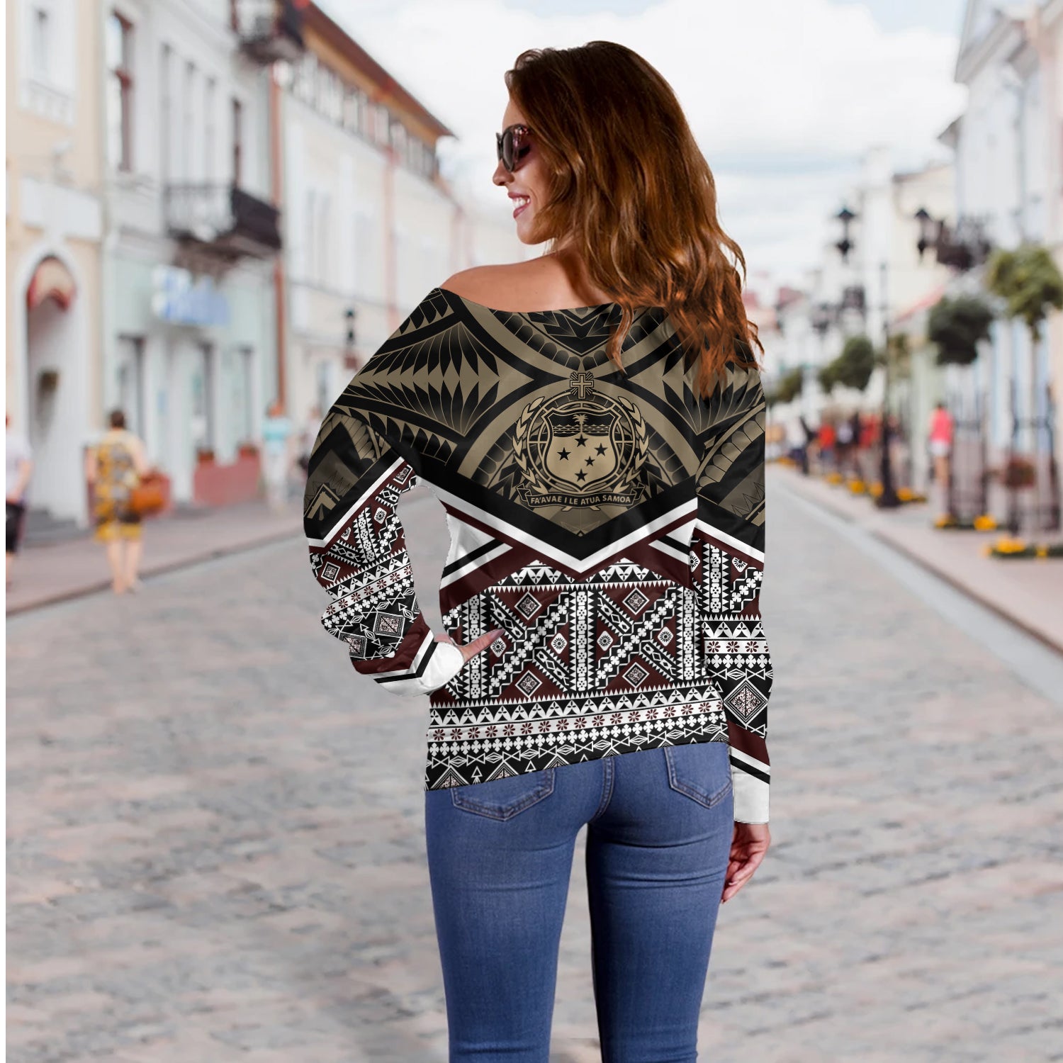 Samoa Off Shoulder Sweatshirt - Samoa Masi Dobby Coat Of Arms