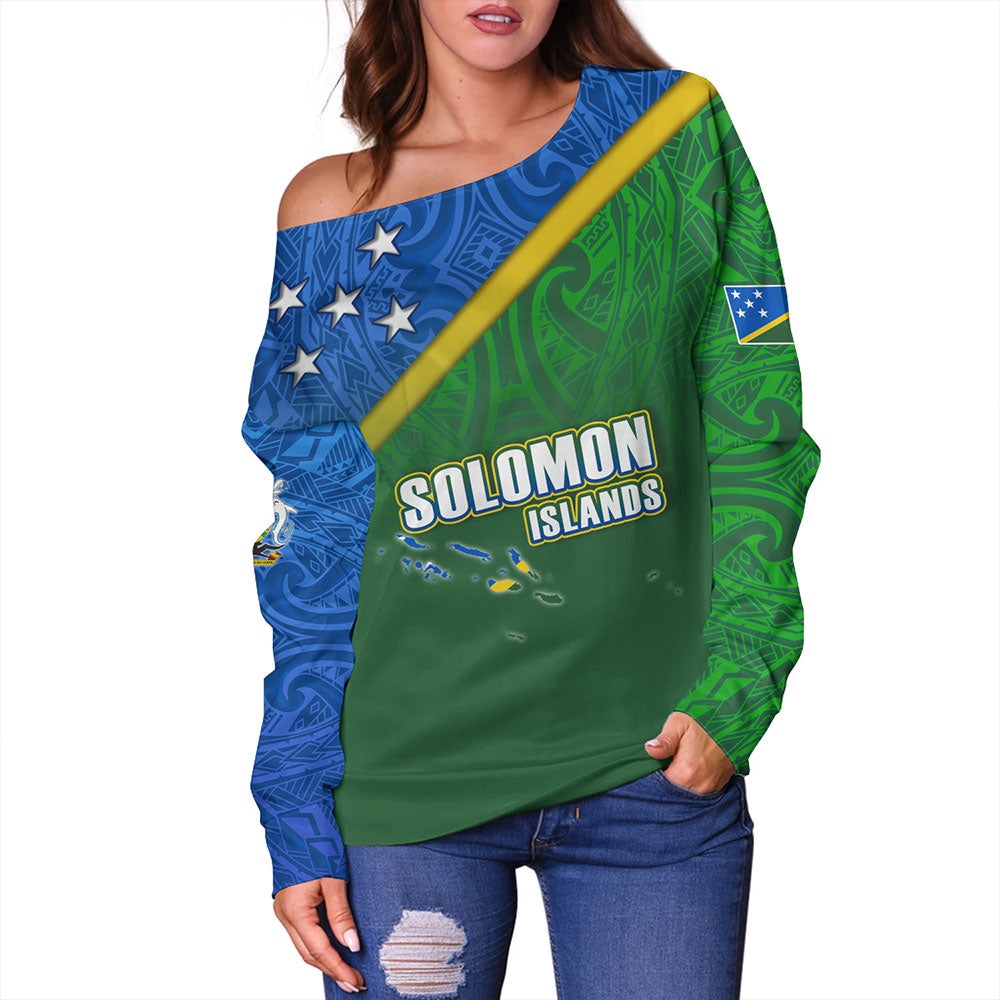 Solomon Islands Off Shoulder Sweatshirt Flag Color With Traditional Patterns