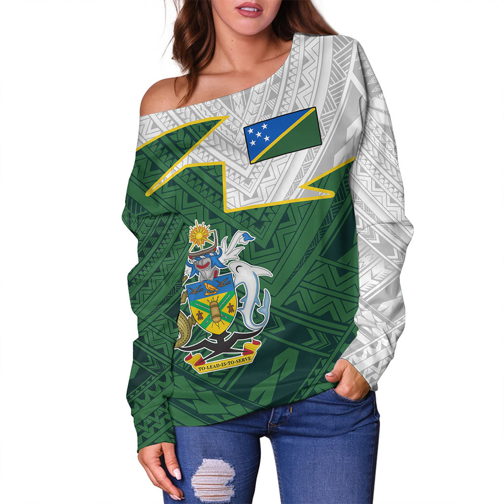 Solomon Islands Off Shoulder Sweatshirt Polynesian Tattoo Flag And Coat Of Arms