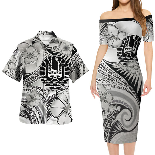 Tahiti Combo Short Sleeve Dress And Shirt Polynesian Tribal Waves Patterns Hibiscus Flowers