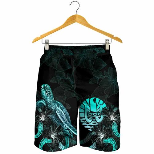 Tahiti Polynesian Men Shorts - Turtle With Blooming Hibiscus Turquoise