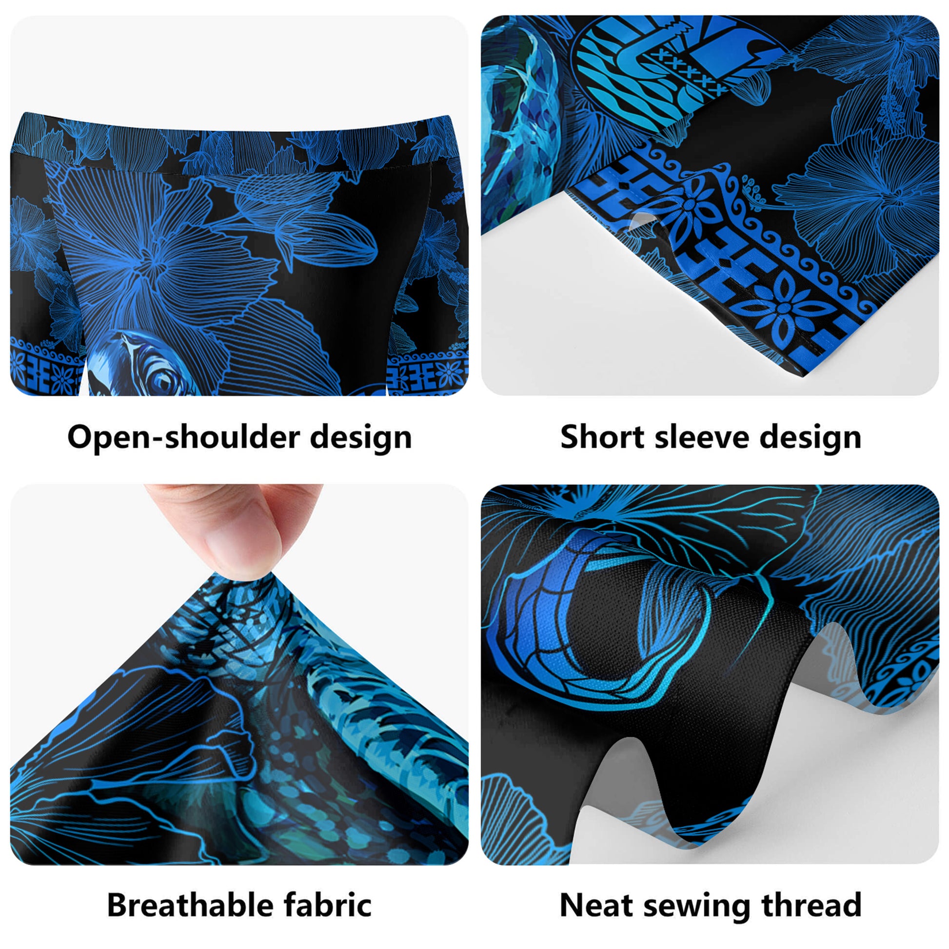 Tahiti Short Sleeve Off The Shoulder Lady Dress Sea Turtle With Blooming Hibiscus Flowers Tribal Blue