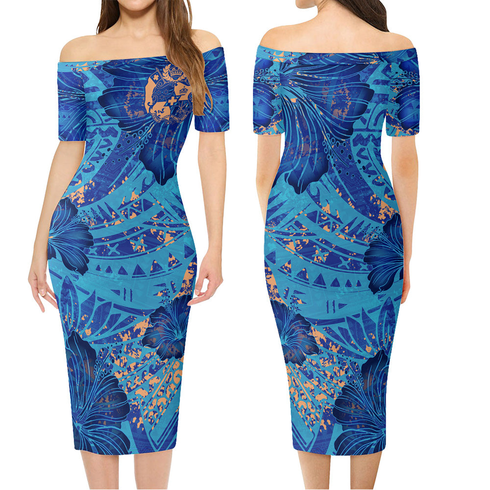 Tonga Combo Short Sleeve Dress And Shirt Hibiscus With Polynesian Pattern Blue Version
