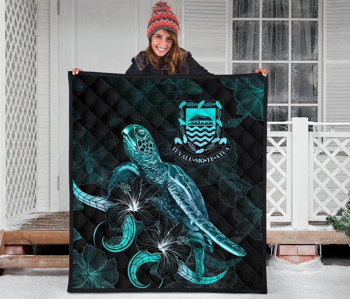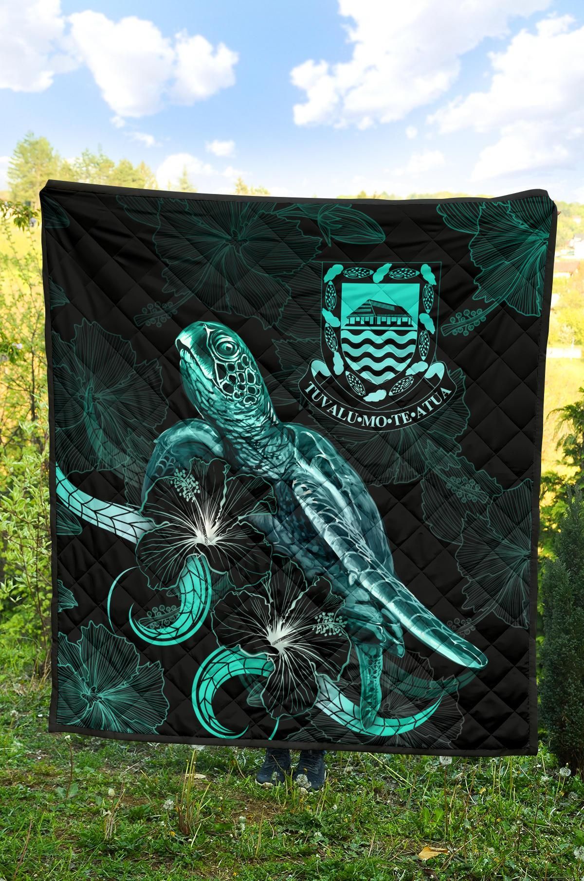 Tuvalu Polynesian Premium Quilt - Turtle With Blooming Hibiscus Turquoise