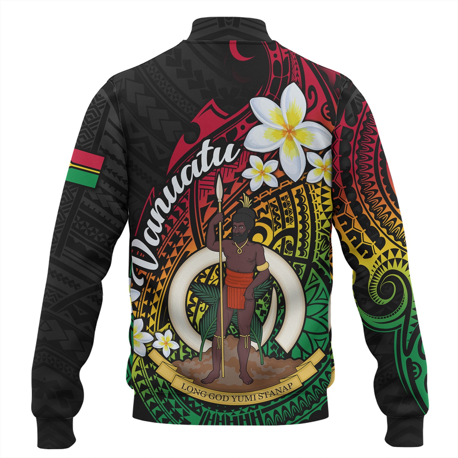 Vanuatu Baseball Jacket Custom Plumeria Flowers Tribal Motif Flag Color Design