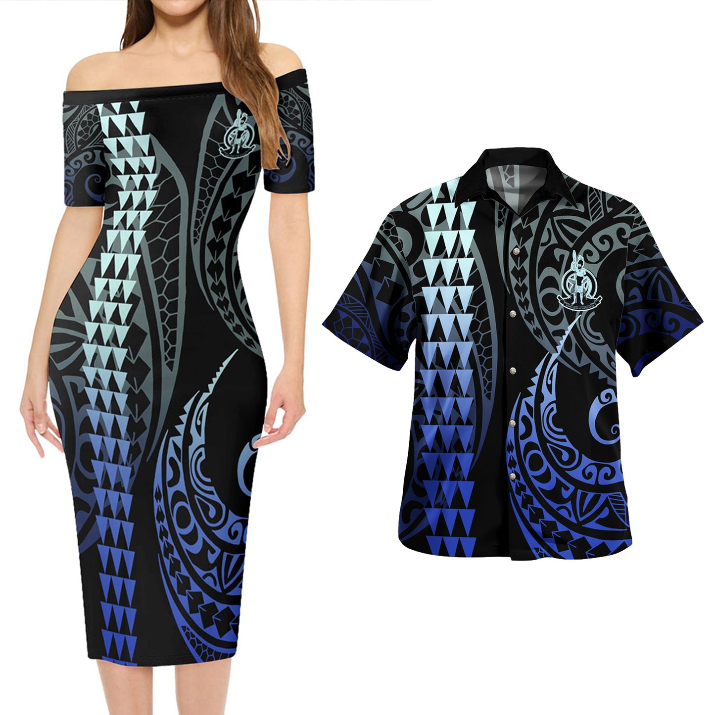 Vanuatu Combo Short Sleeve Dress And Shirt Kakau Style Gradient Blue