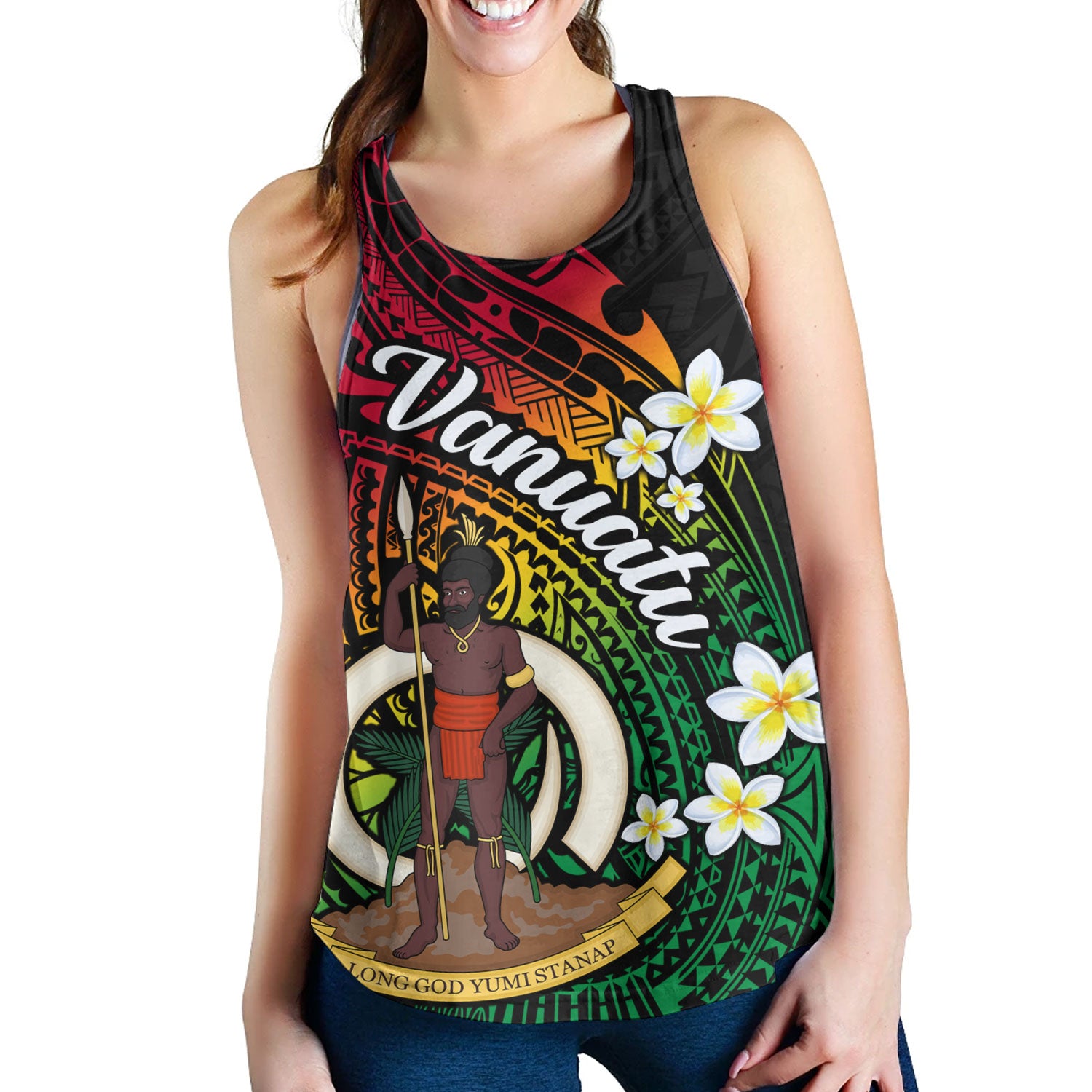 Vanuatu Women Tank Custom Plumeria Flowers Tribal Motif Flag Color Design