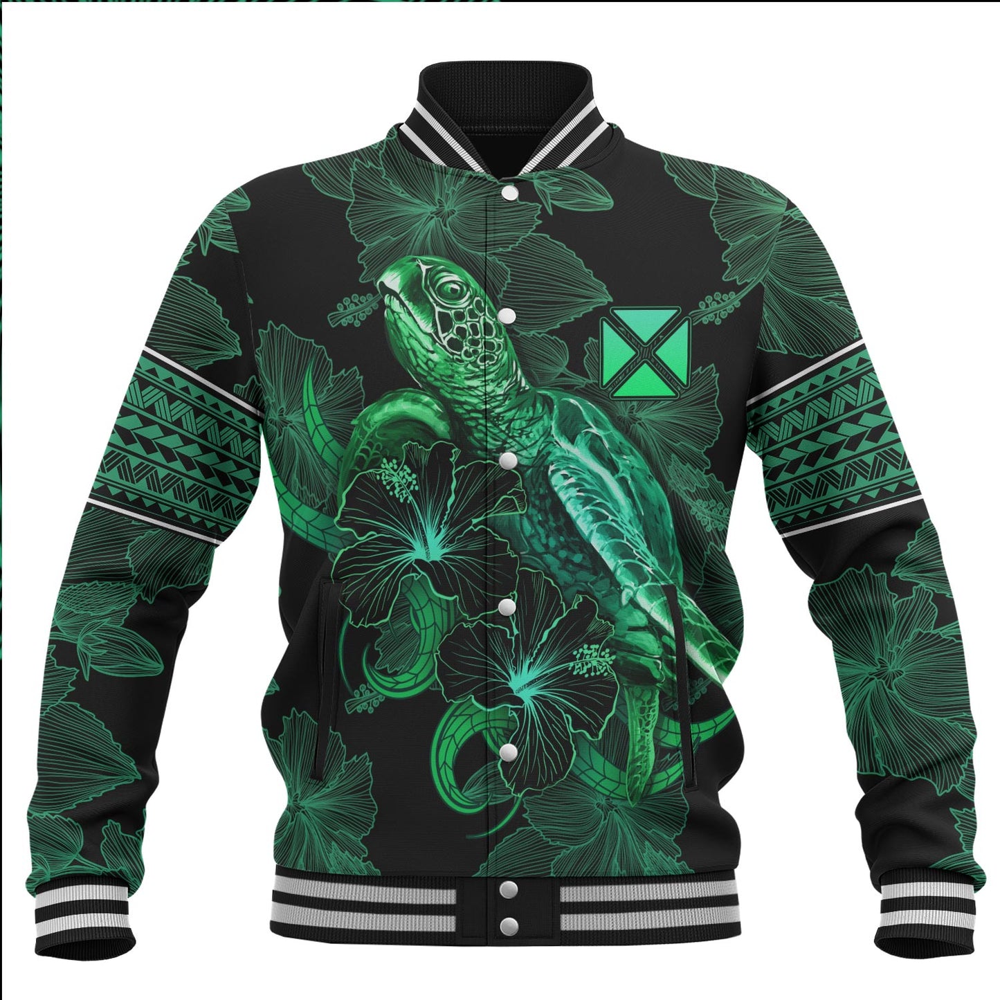 Wallis And Futuna Baseball Jacket Sea Turtle With Blooming Hibiscus Flowers Tribal Green