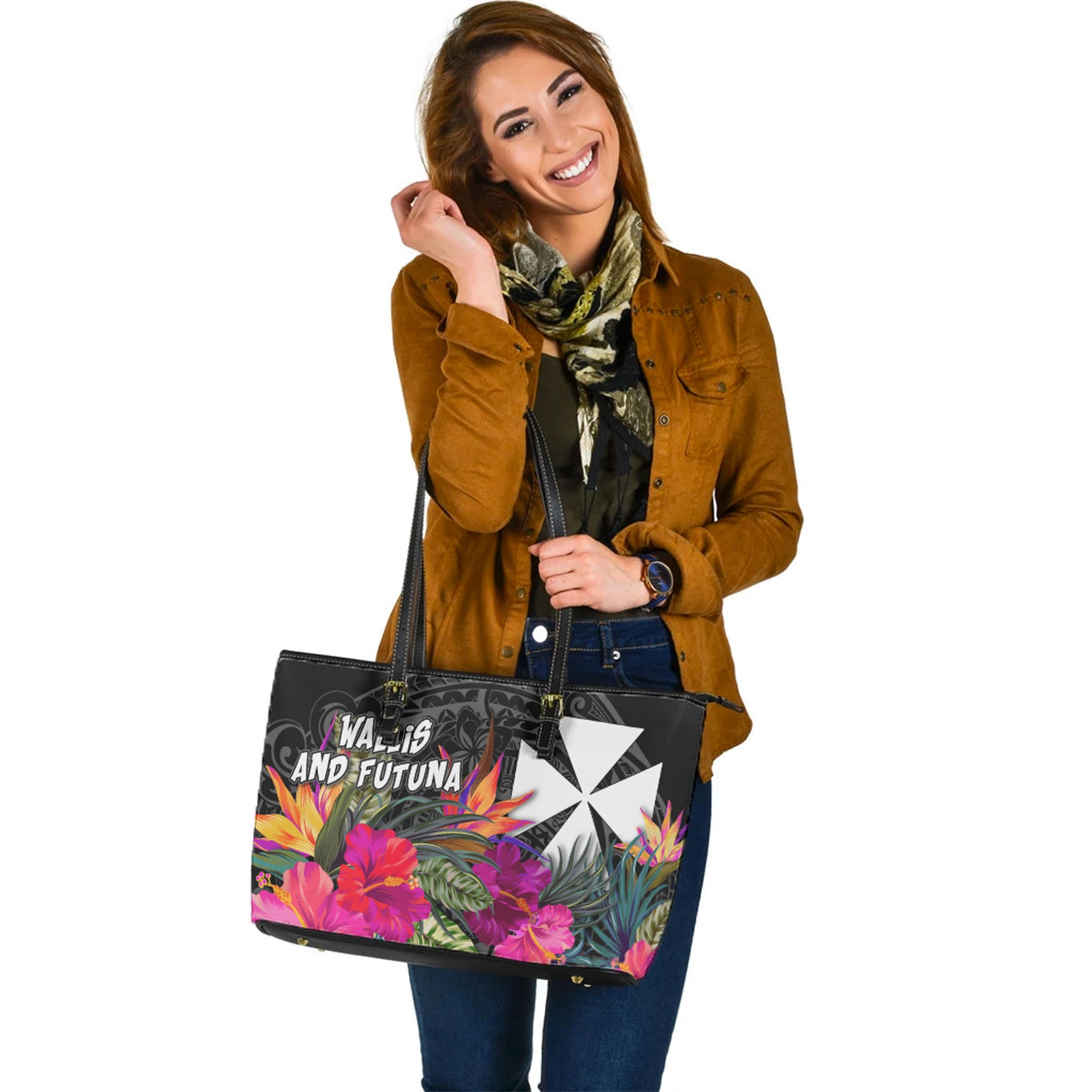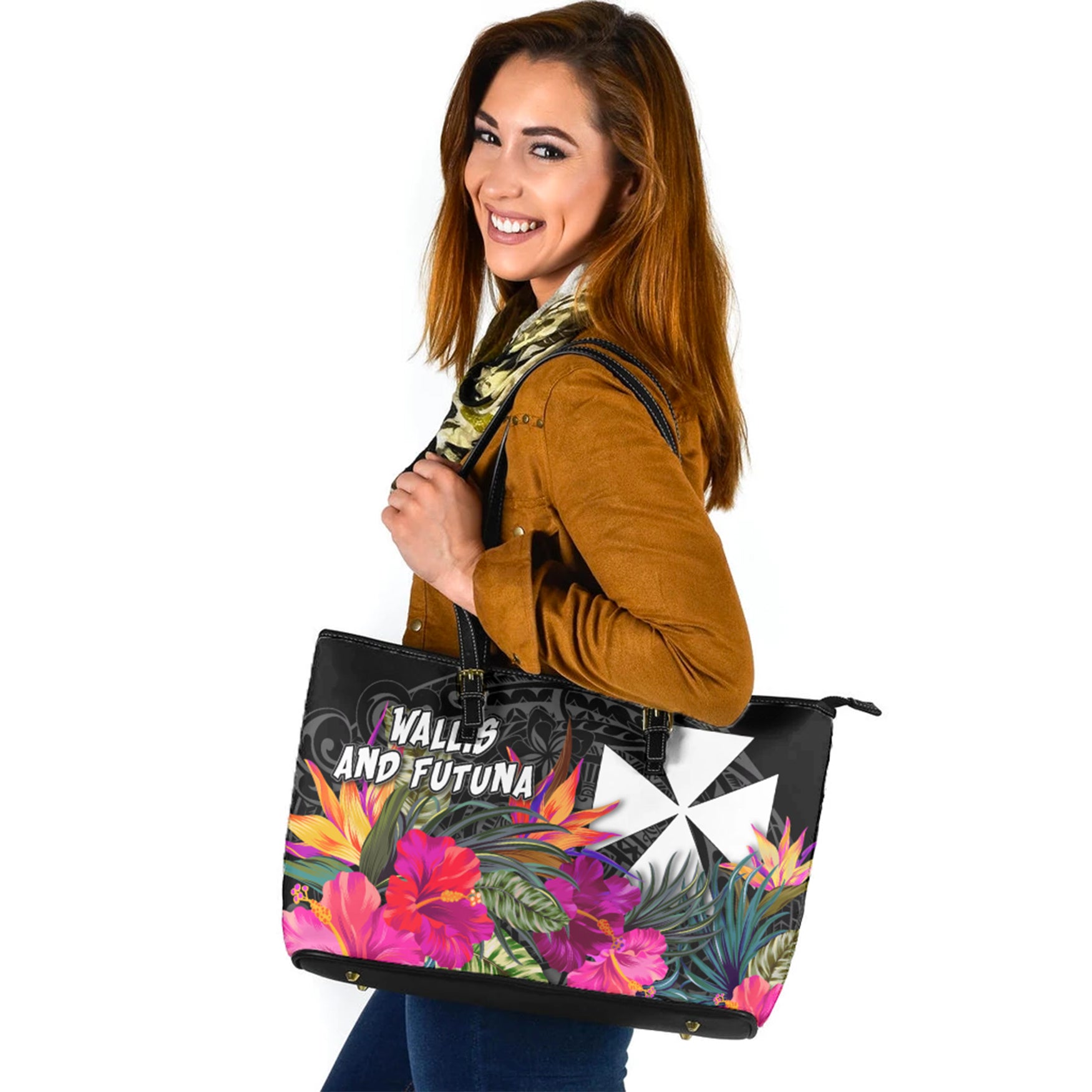 Wallis and Futuna Custom Personalised Leather Tote Polynesian Hibiscus Pattern