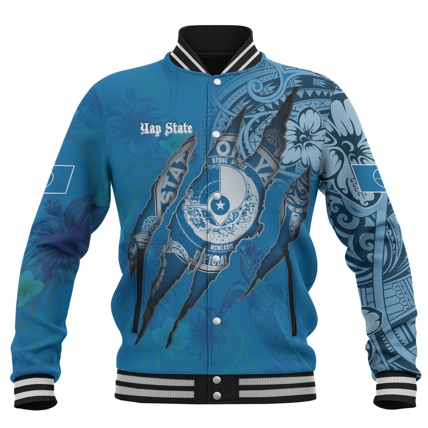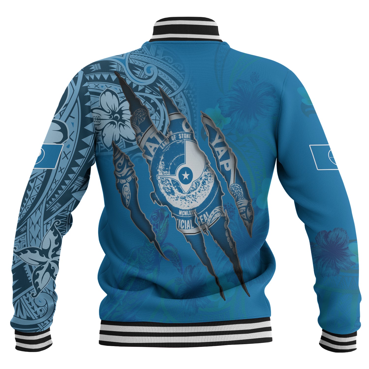 Yap State Baseball Jacket Custom Yapese Blood Inside Me Polynesian Sleeve Tattoo Tropical Blue