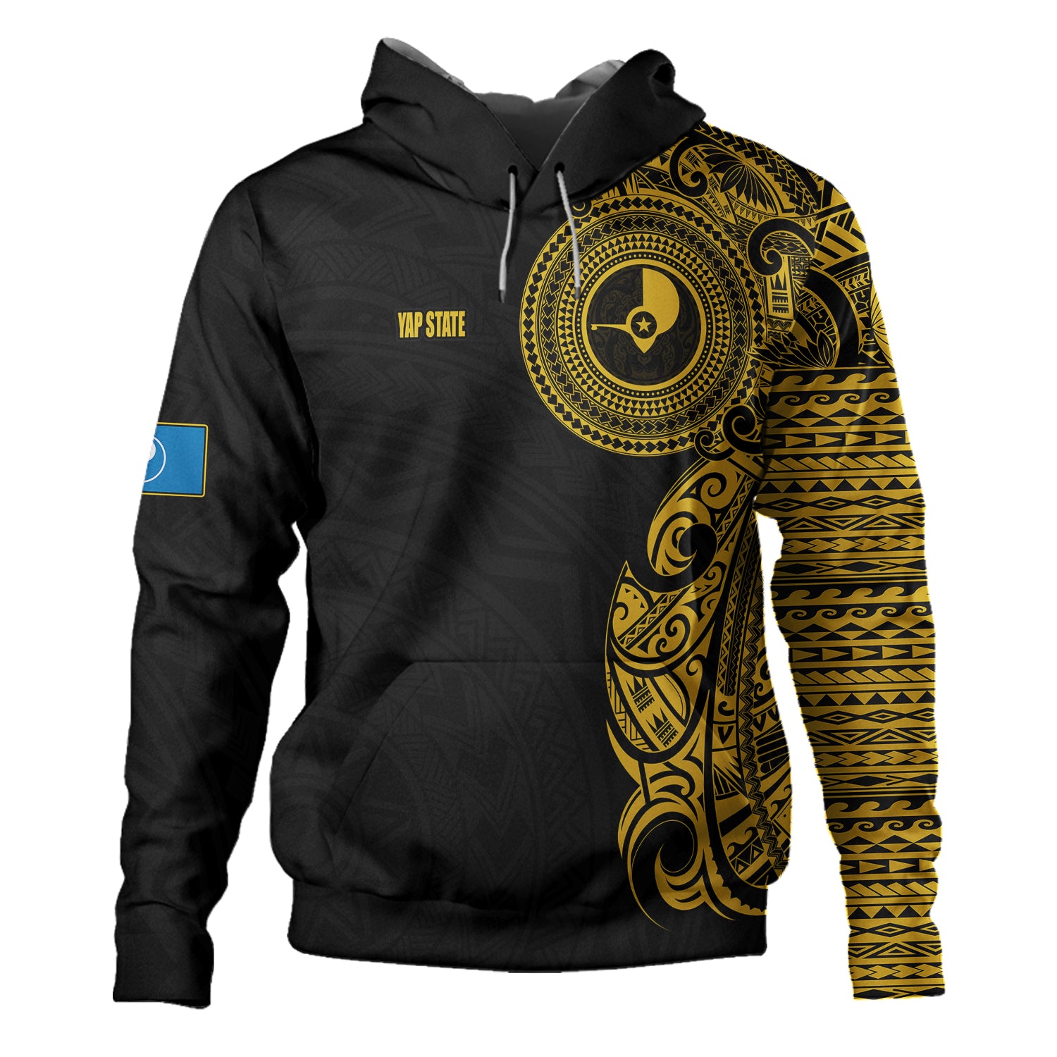 Yap State Hoodie Custom Polynesian Half Sleeve Gold Tattoo With Seal Black