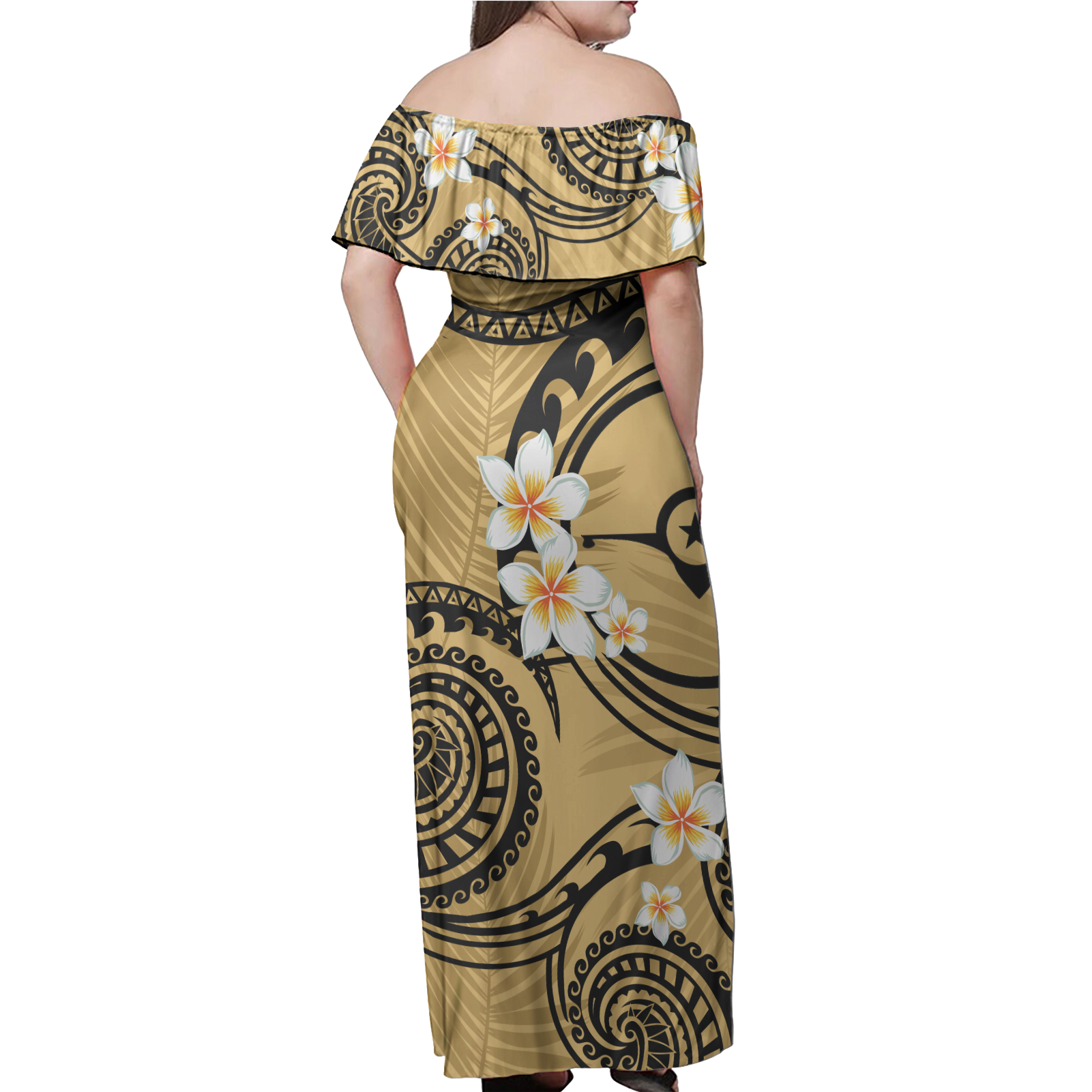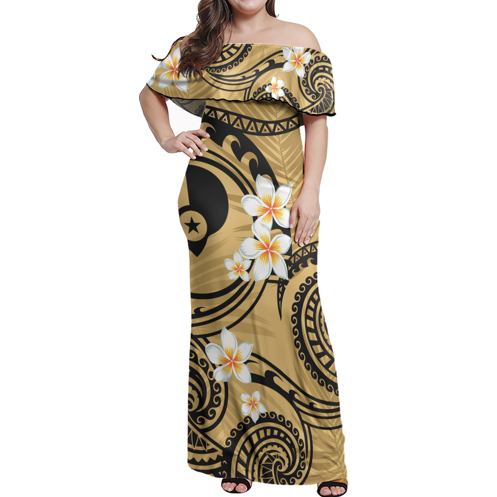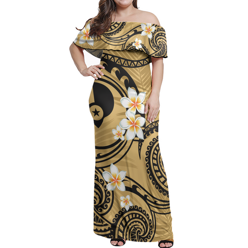 Yap State Off Shoulder Long Dress Plumeria Flowers Tribal Motif Yellow Version