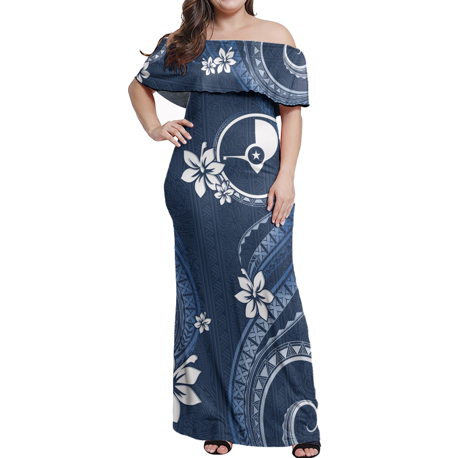 Yap State Off Shoulder Long Dress White Hibiscus Blue Pattern