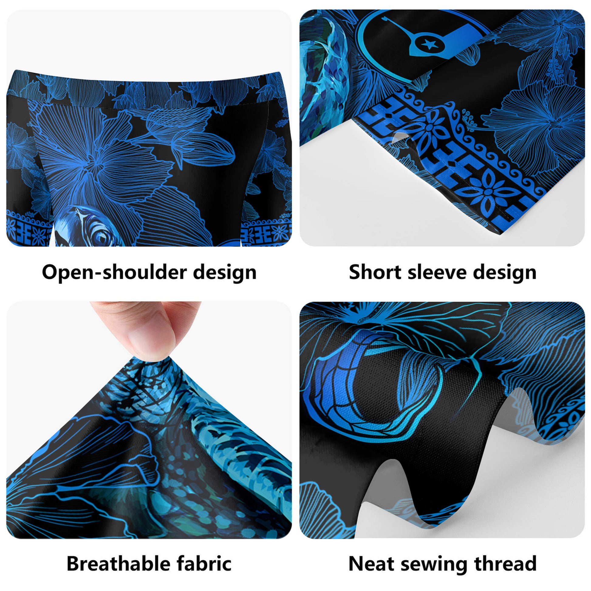 Yap State Short Sleeve Off The Shoulder Lady Dress Sea Turtle With Blooming Hibiscus Flowers Tribal Blue
